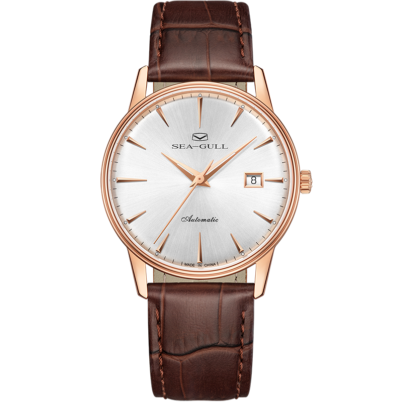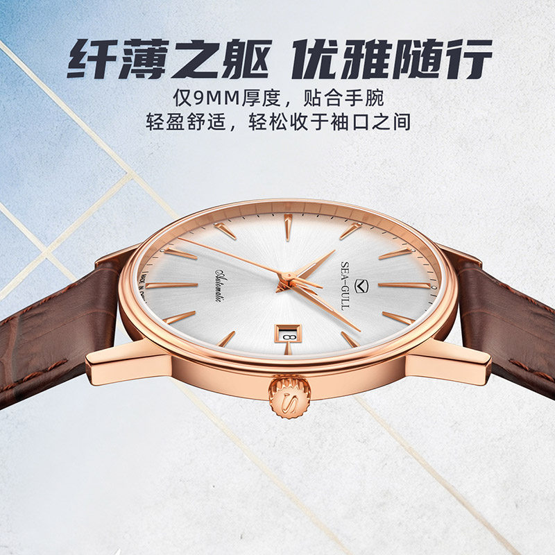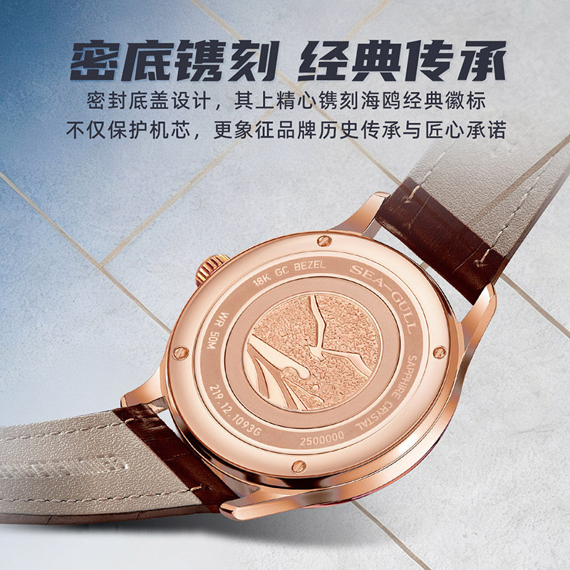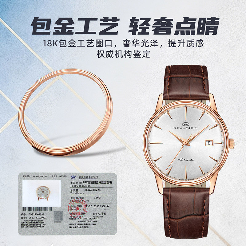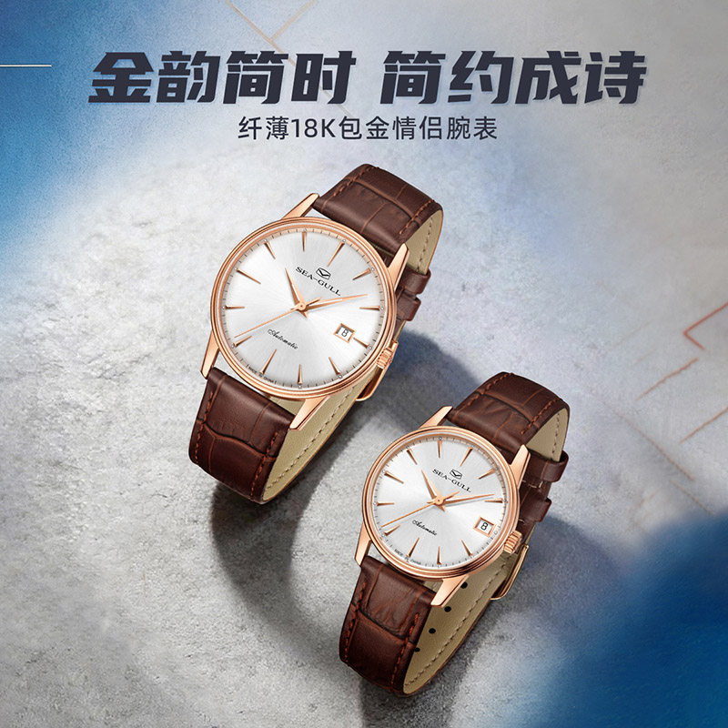 新品海鸥表轻奢机械表皮带18K包金圈口手表男女款情侣腕表1093G