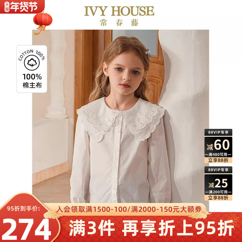 IVY HOUSE常春藤儿童装女童2025春季新款 双层绣花领洋气白衬衫棉