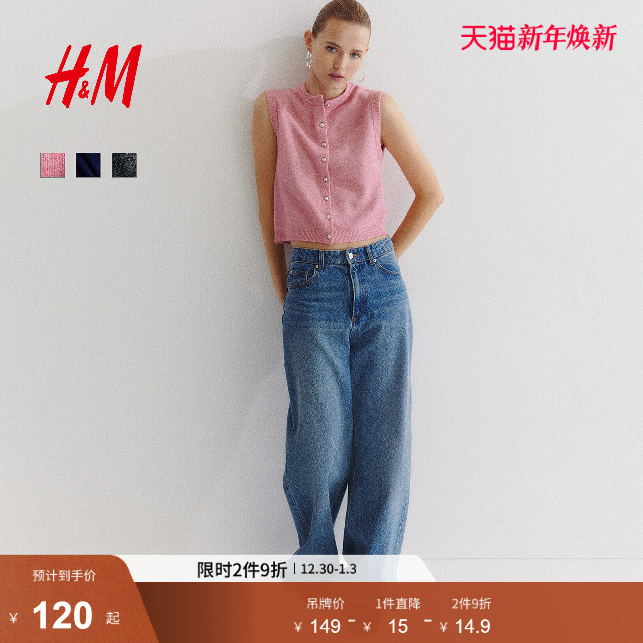 HM女装毛针织衫2025冬季新款文艺圆领单排扣无袖背心开衫1296848