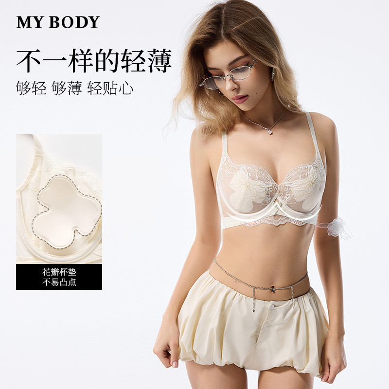 MYBODY商场同款新款大胸显小内衣防下垂轻透网纱蕾丝花瓣杯女文胸