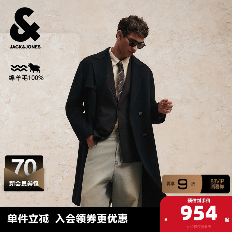 杰克琼斯奥特莱斯男装秋季毛呢大衣纯羊毛双排扣长款外套
