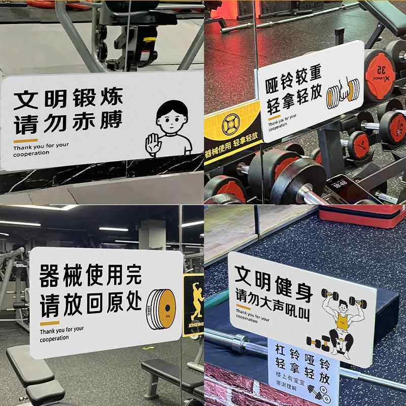 健身房标识牌健身房标语贴纸哑铃器械归位温馨提示牌禁止赤膊文明告知健身器材安全警示请勿吼叫注意事项墙贴