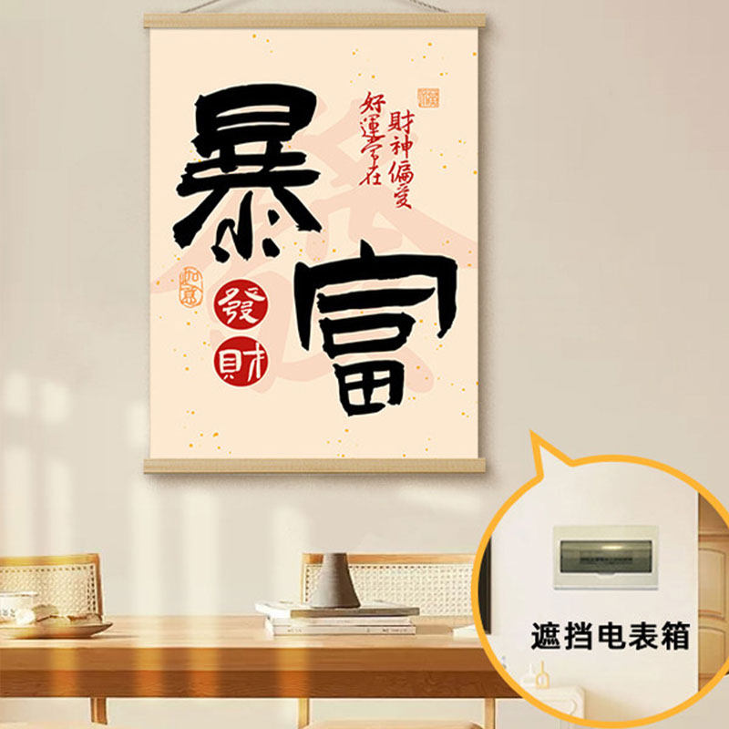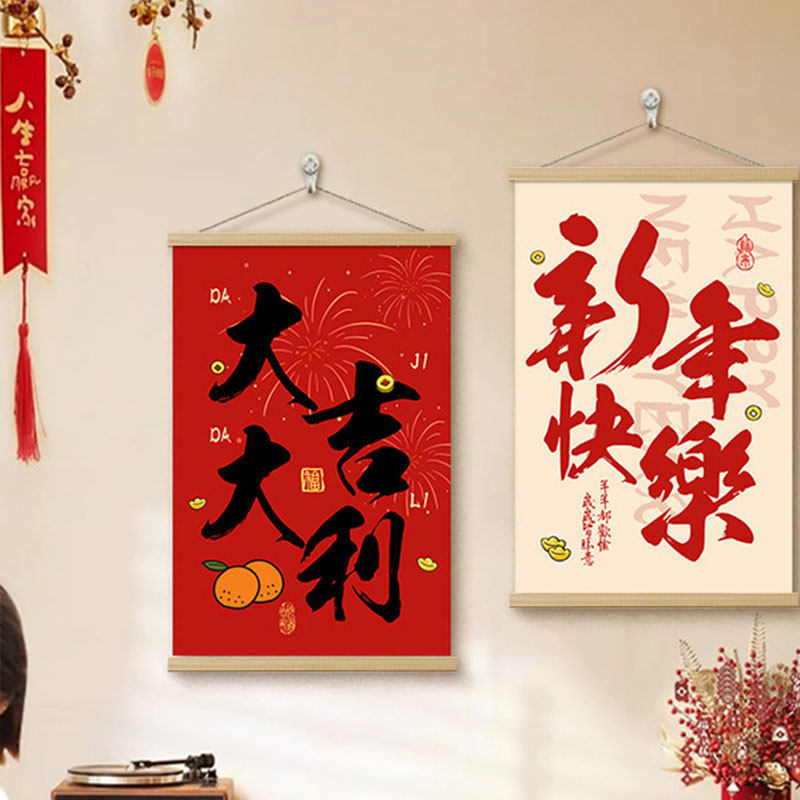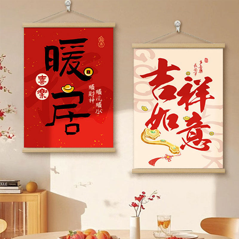 新中式暖居客厅挂绳画新年寓意好背景墙装饰画喜庆氛围布置卷轴画