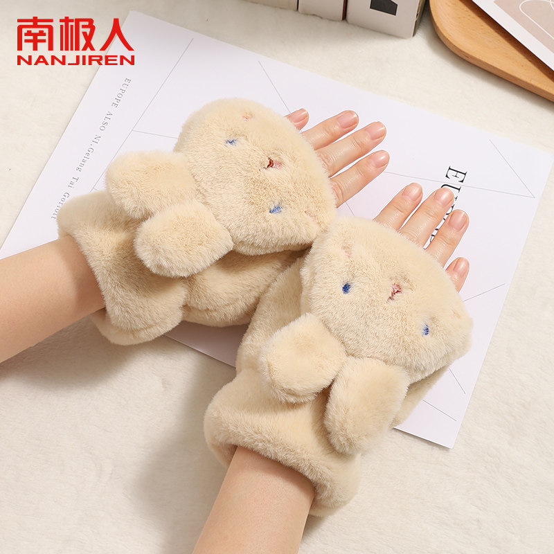 毛绒手套女秋冬季加厚防寒学生写字可爱办公室加绒骑行翻盖触屏J