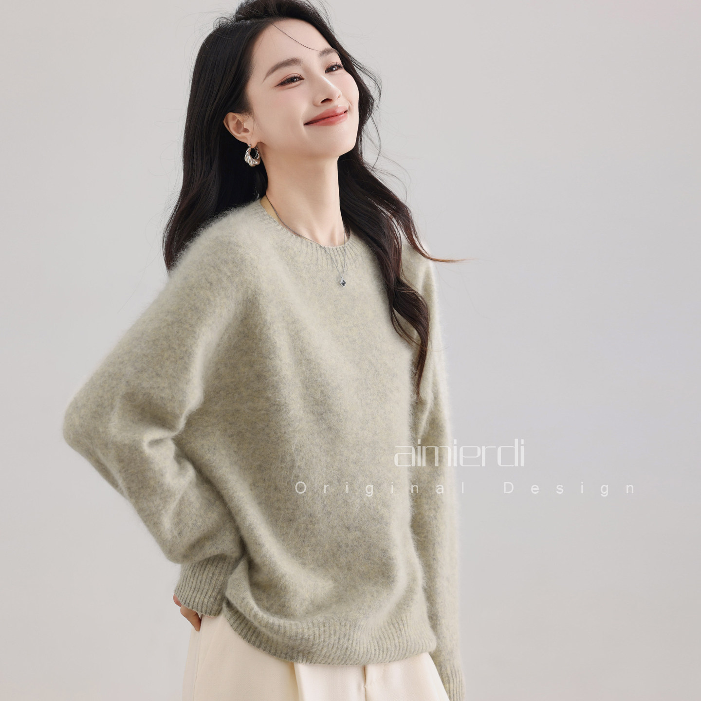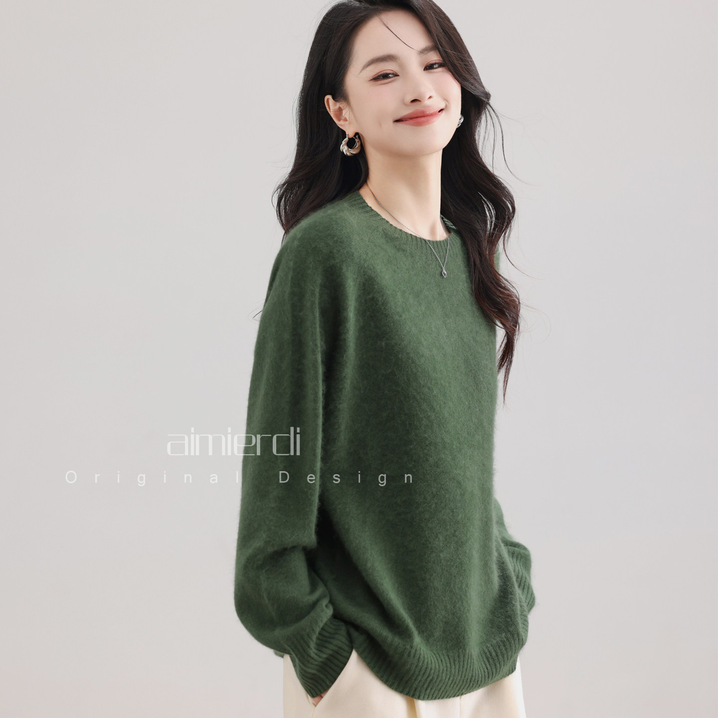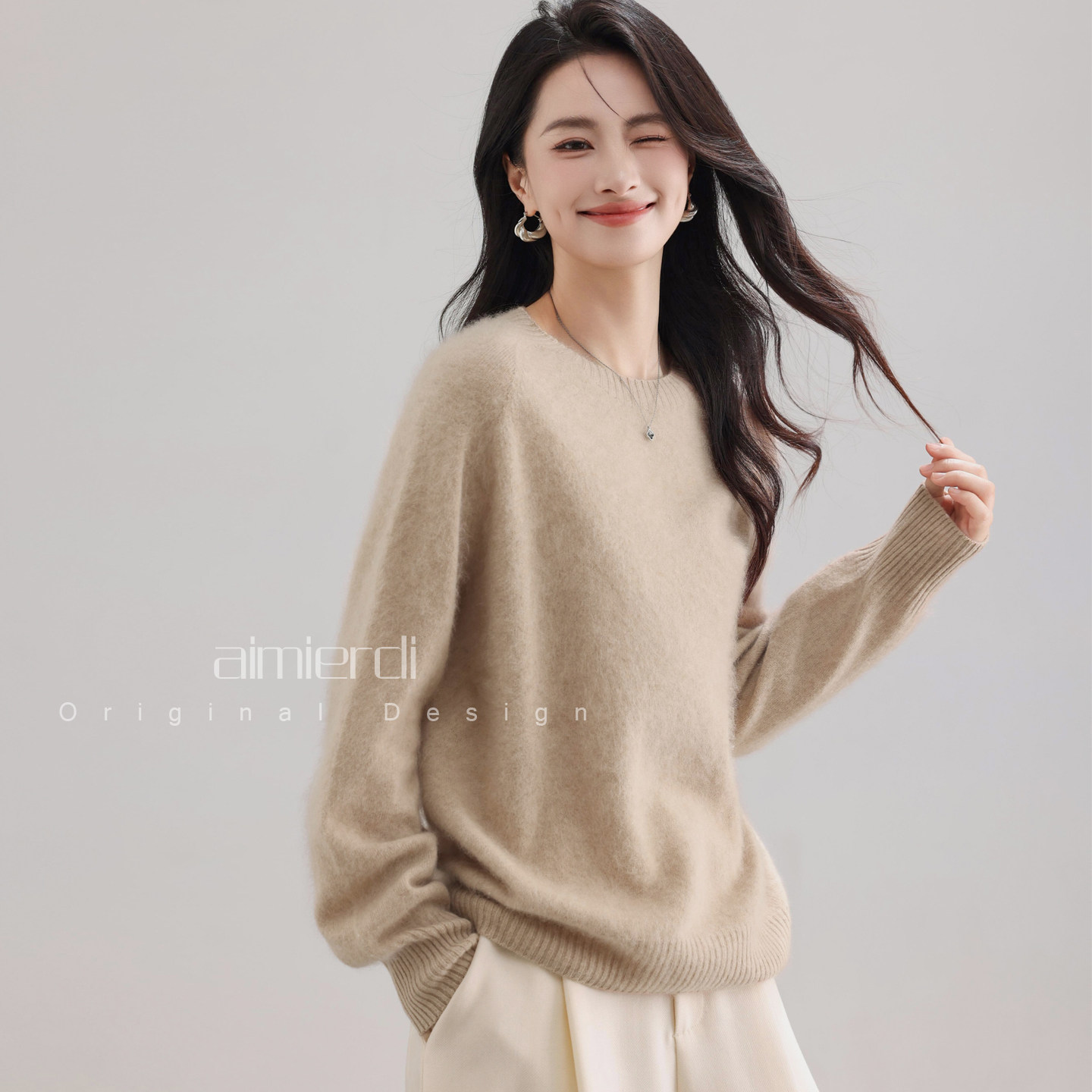 aimierdi法式经典圆领松弛感拉绒透气保暖羊毛绒衫通勤百搭老钱风