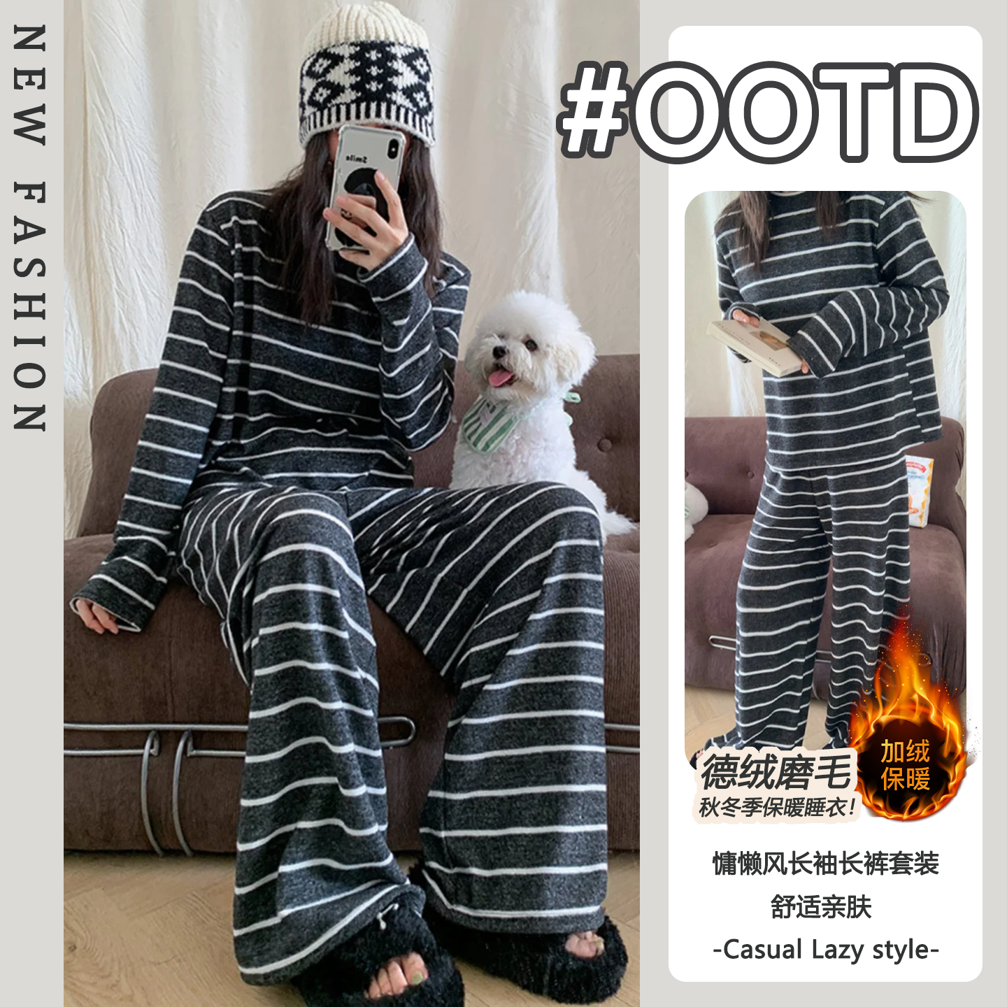 ins高级感长袖秋冬季女款德绒磨毛保暖条纹网红宅家睡衣简约套装