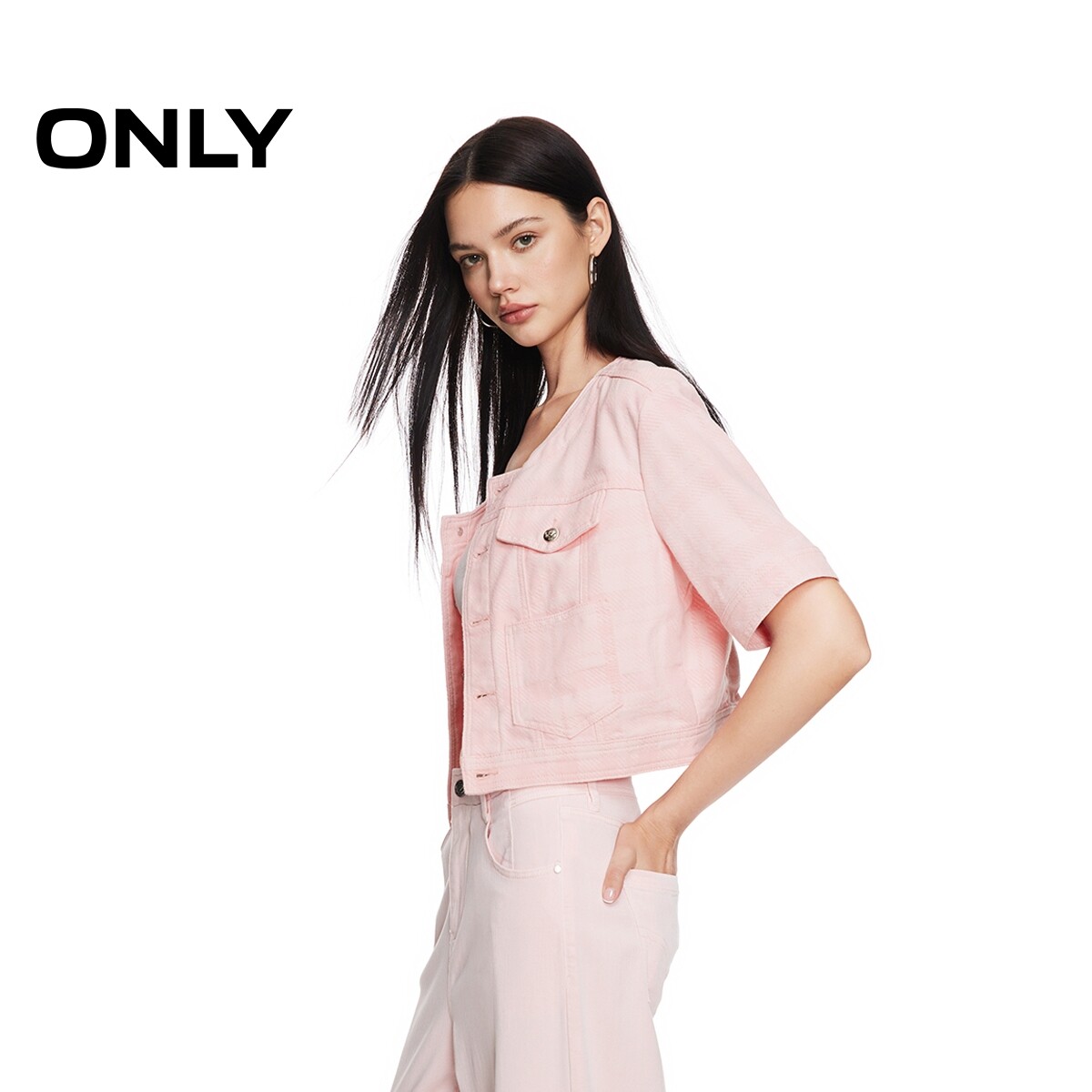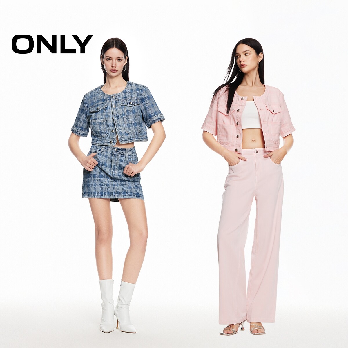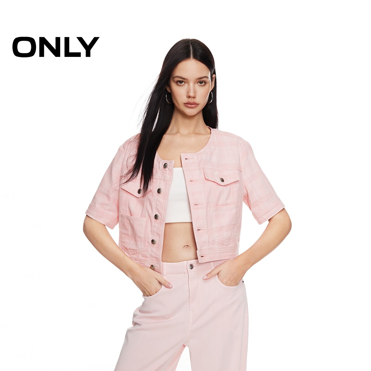 【ONLY奥莱】春季新款时尚百搭格纹直筒圆领短款牛仔外套女