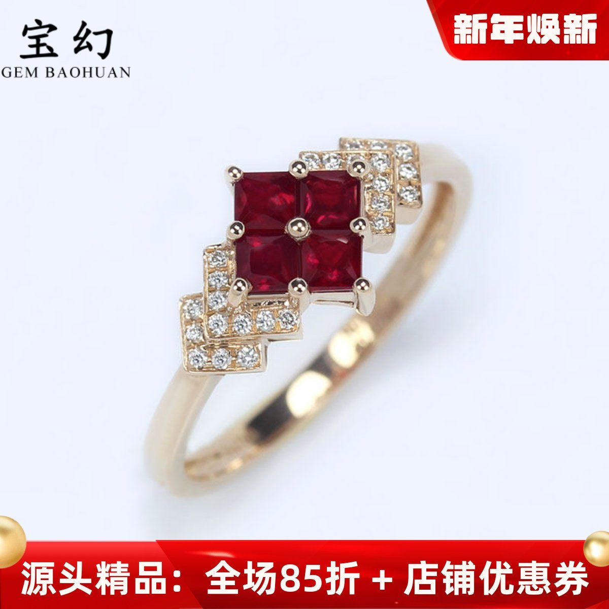 G18K玫瑰金天然鸽血红宝石钻石方形四叶草戒指 彩金正品手饰女款