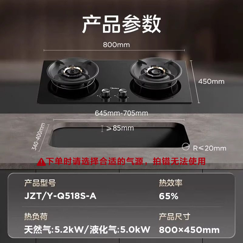美的燃气灶Q518S-A天然气双灶5.2kW猛火灶家用防干烧烟灶联动