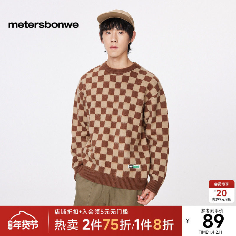 美特斯邦威男秋冬季圆领时尚拼色方格拉毛长袖套头毛衫