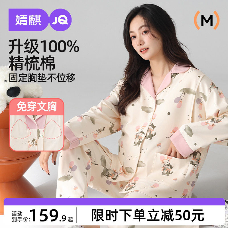 婧麒带胸垫月子服纯棉春秋产后孕妇睡衣哺乳喂奶怀孕期产妇家居服