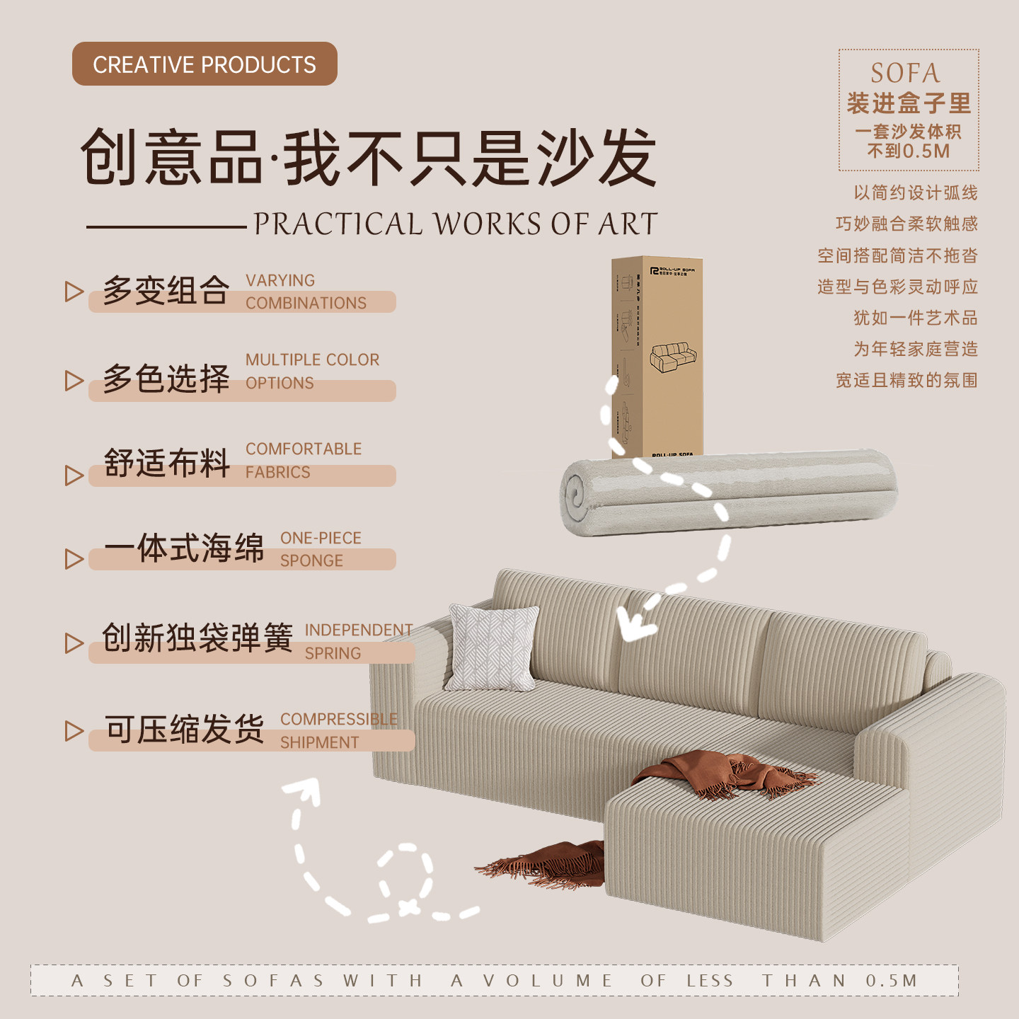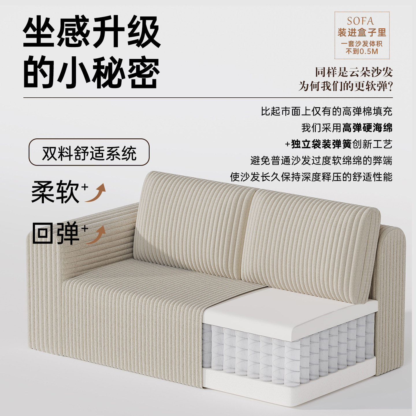 奶油风轻奢现代简约卷包压缩沙发小户型全海绵灯芯绒单双懒人贵妃
