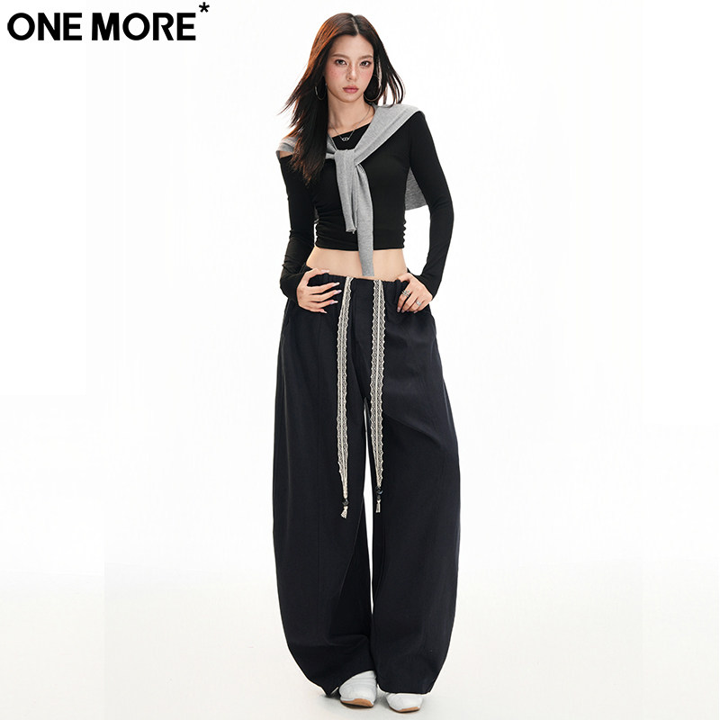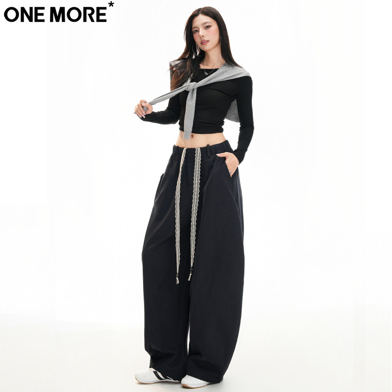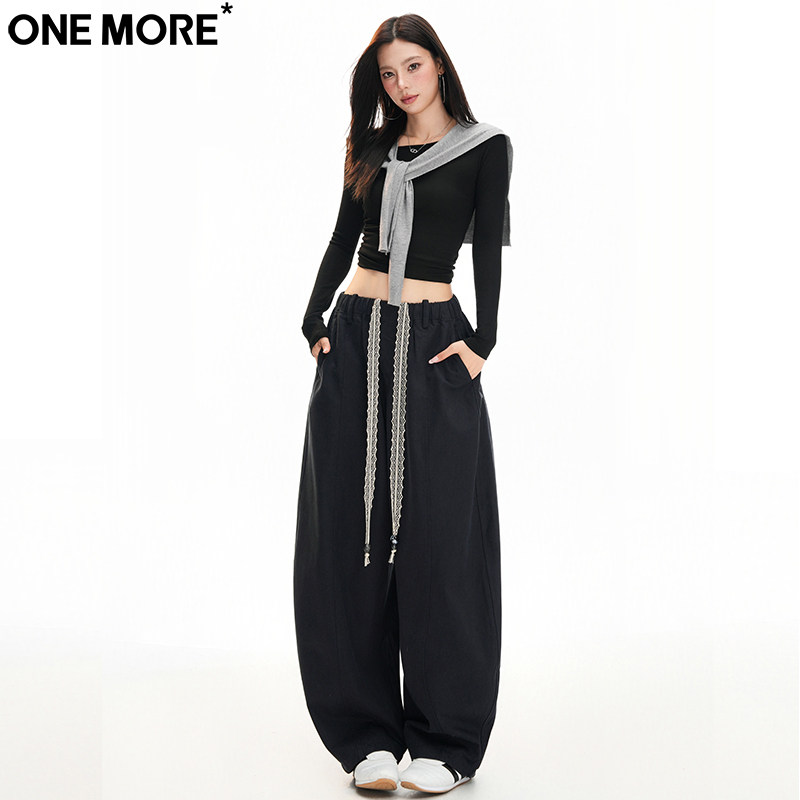 One More抗皱抽绳高腰弯刀牛仔裤女秋冬季新款宽松运动休闲阔腿裤