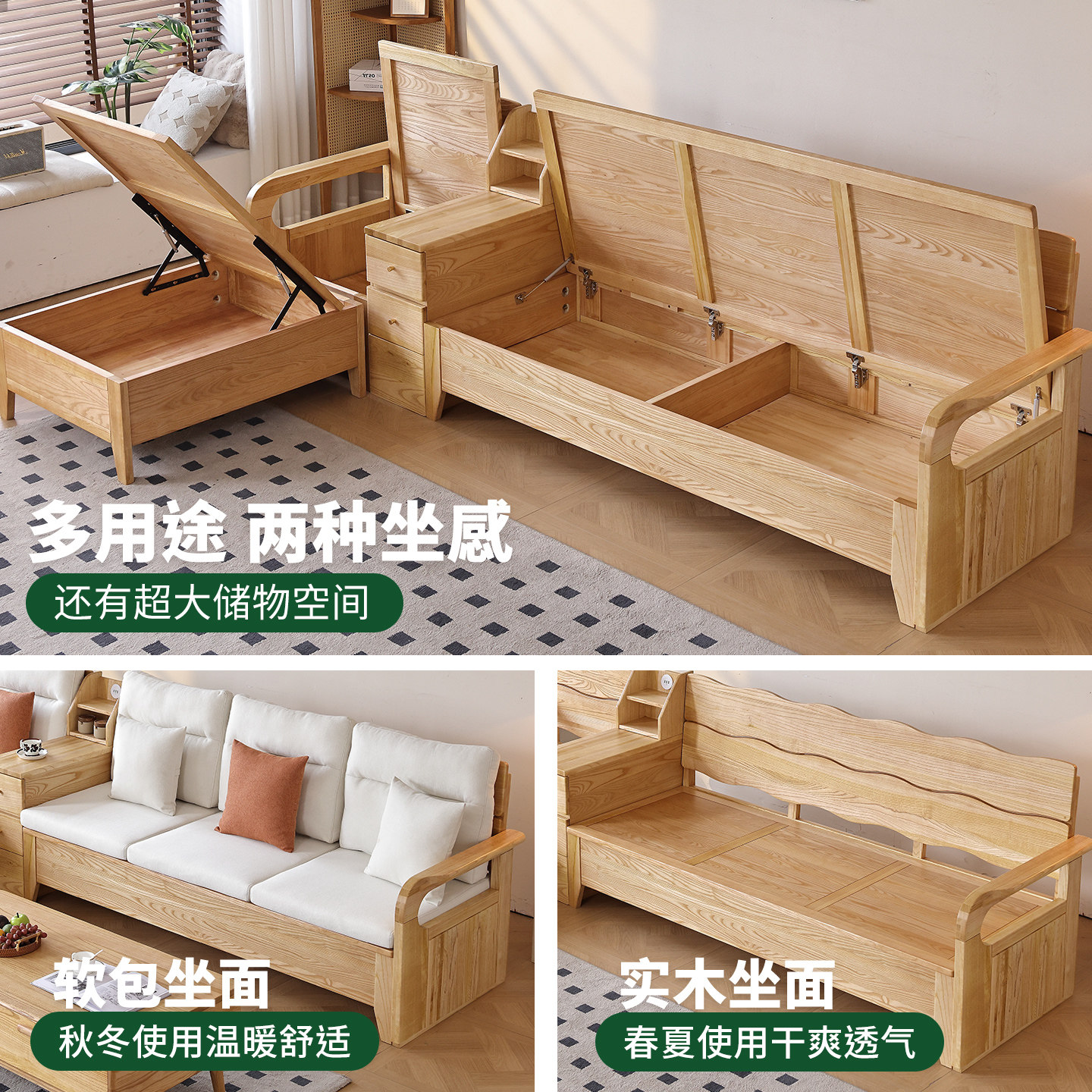 优尚雅轩北美白蜡木实木沙发现代简约原木风高箱储物布艺沙发