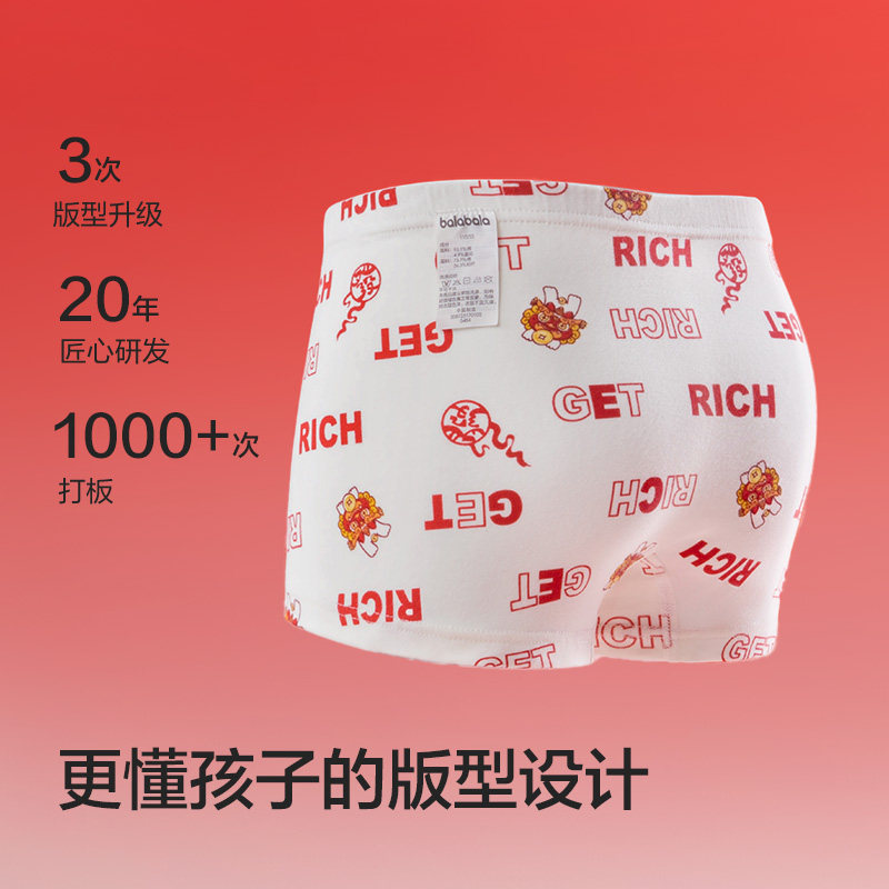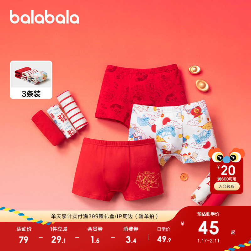 巴拉巴拉男童内裤平角棉本命年红色儿童短裤四角蛇年新年款三条装