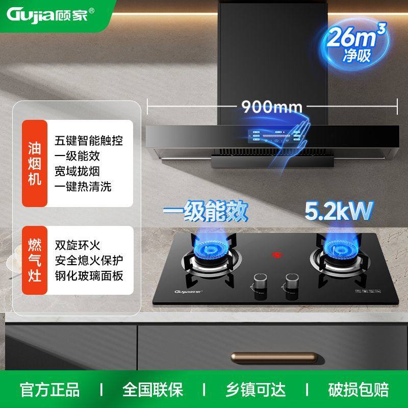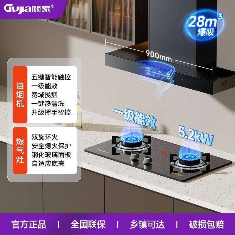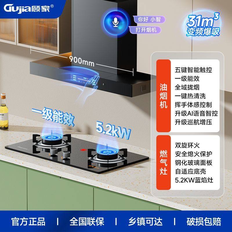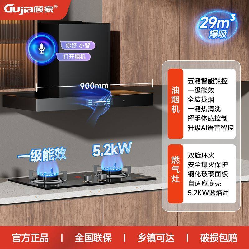 顾家欧式黑色顶吸式AI语音智控熄火保护油烟机燃气灶套装烟灶组合