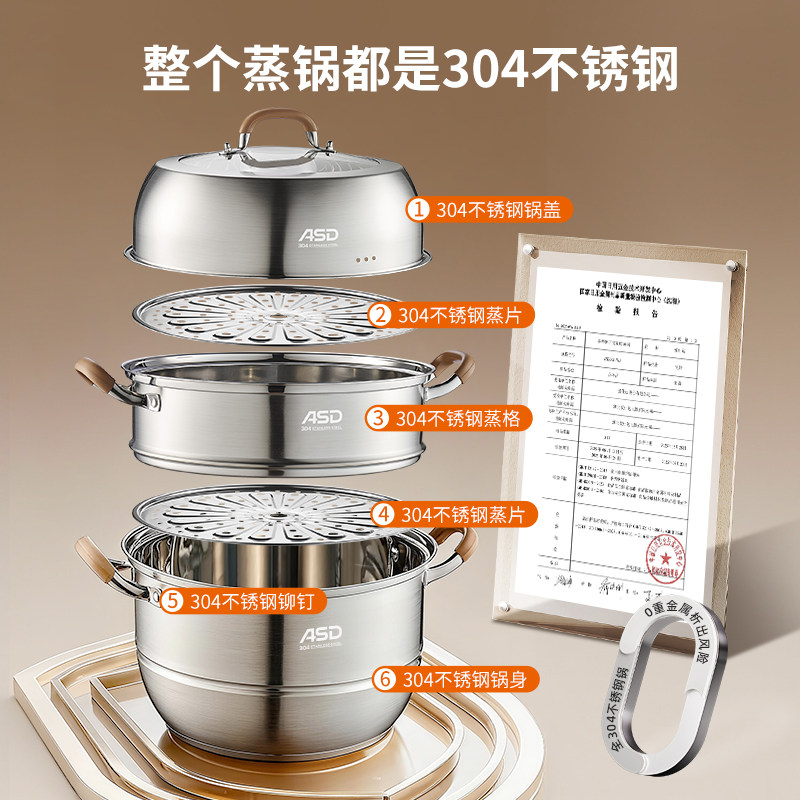 爱仕达蒸锅家用304不锈钢三层加厚蒸笼蒸鱼馒头汤锅燃气电磁炉用