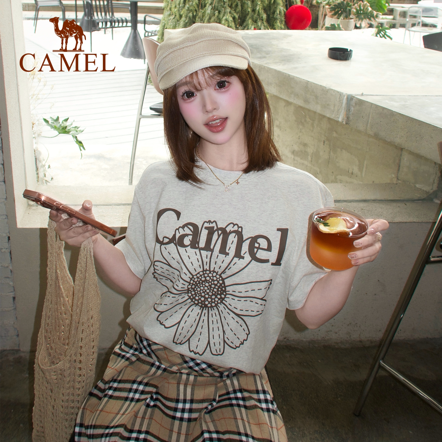 冰感T神骆驼短袖T恤半袖正肩小个子韩系小雏菊夏季新款棉感上衣女