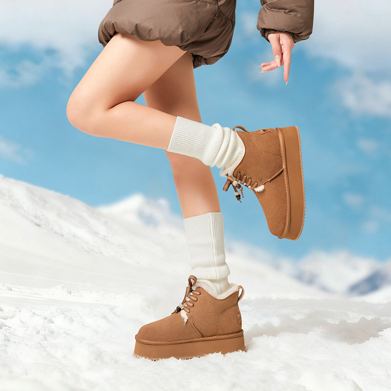 骆驼女鞋2025冬季低帮系带防滑加绒保暖棉鞋厚底雪地靴女