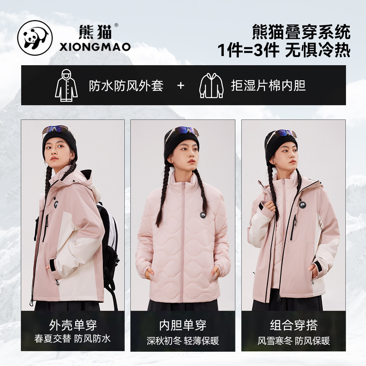 熊猫户外三合一连帽冲锋衣新款防风防水保暖骑行登山服外套