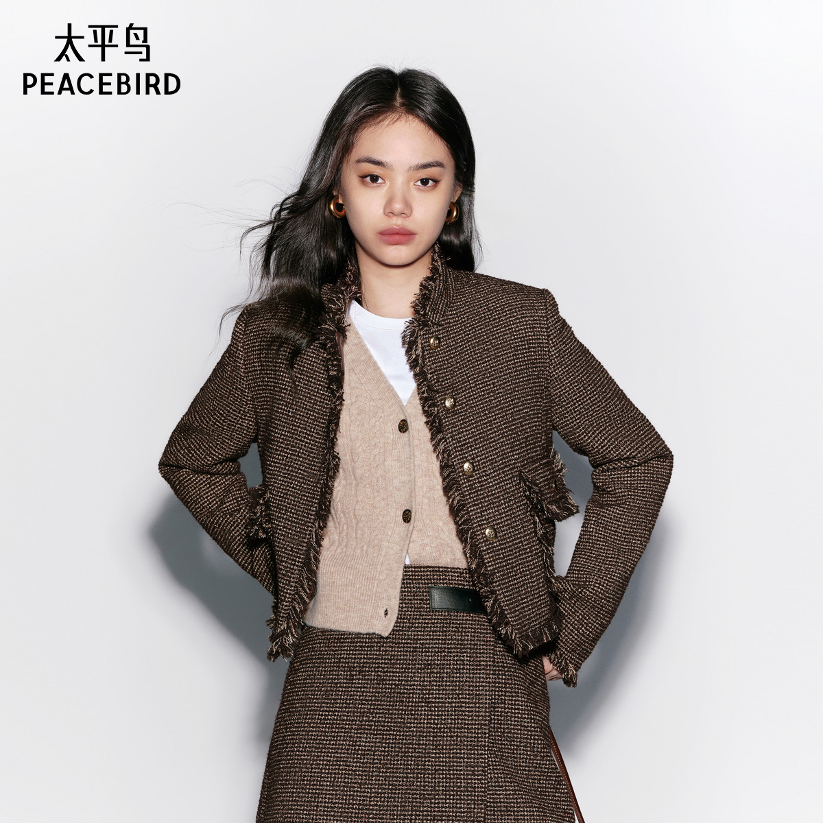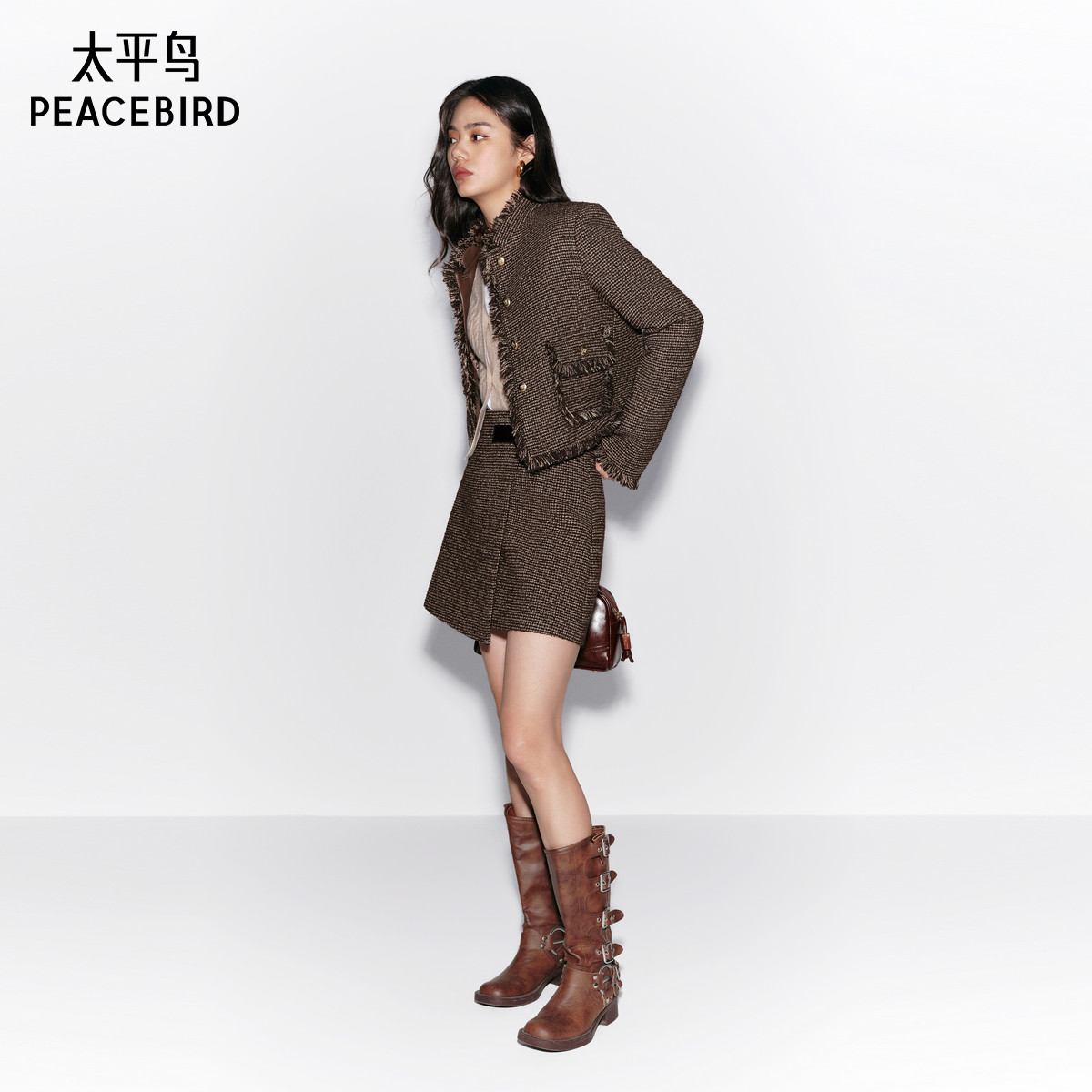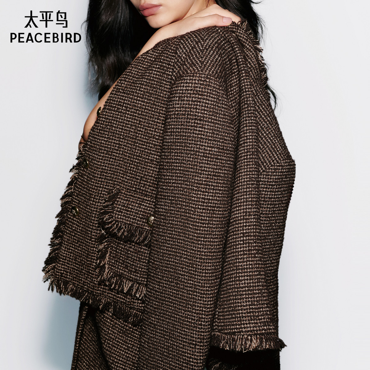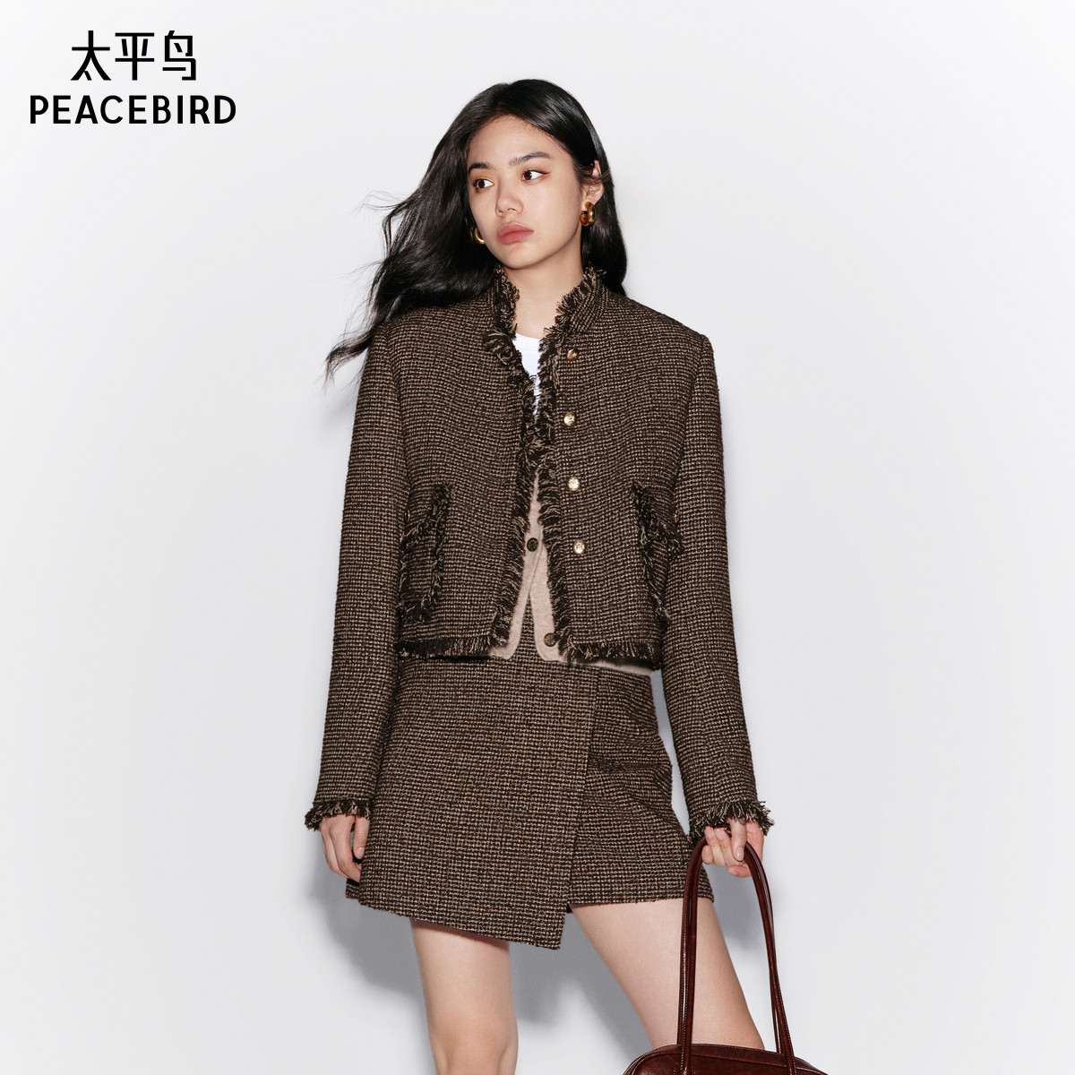 太平鸟绵羊毛立领粗花呢小香风外套冬装新款短款气质高级夹克