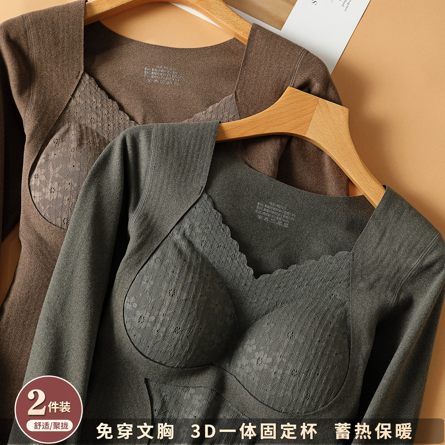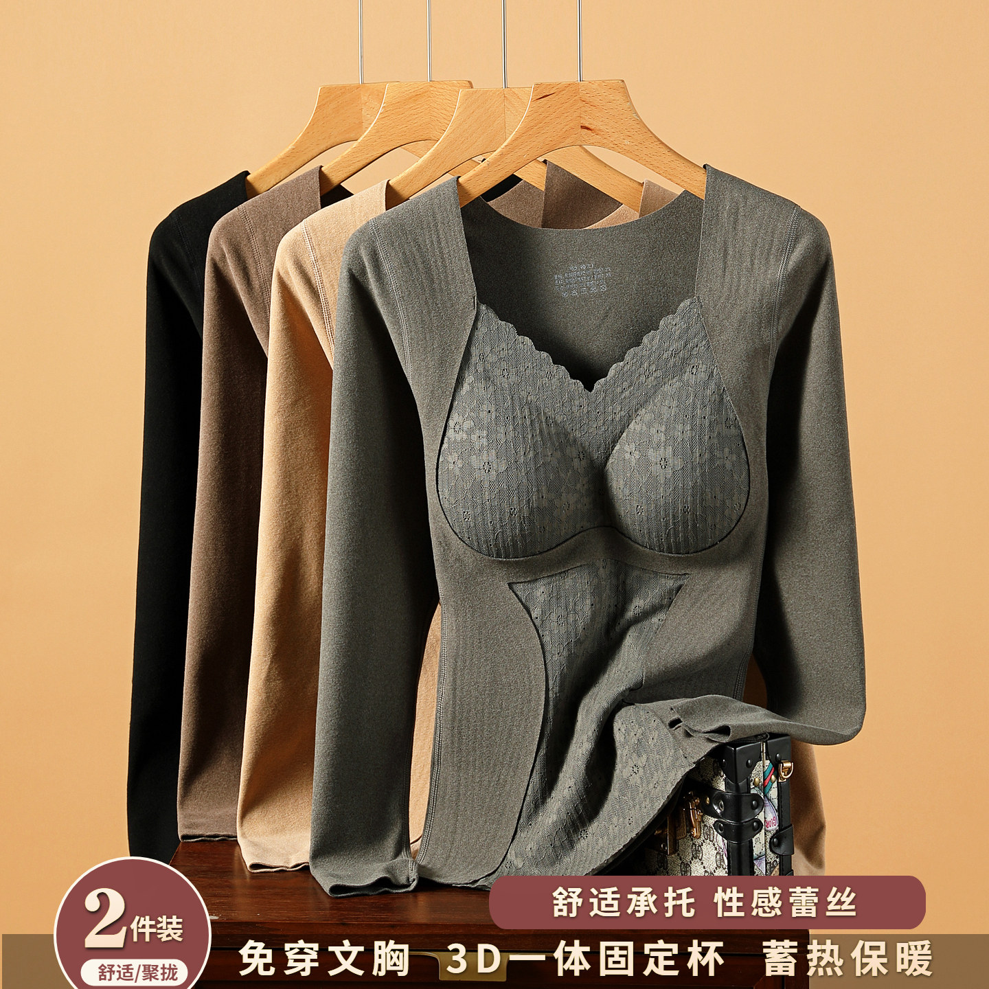 保暖内衣女2025冬带胸垫打底衫蕾丝加绒加厚无痕内穿长袖上衣秋