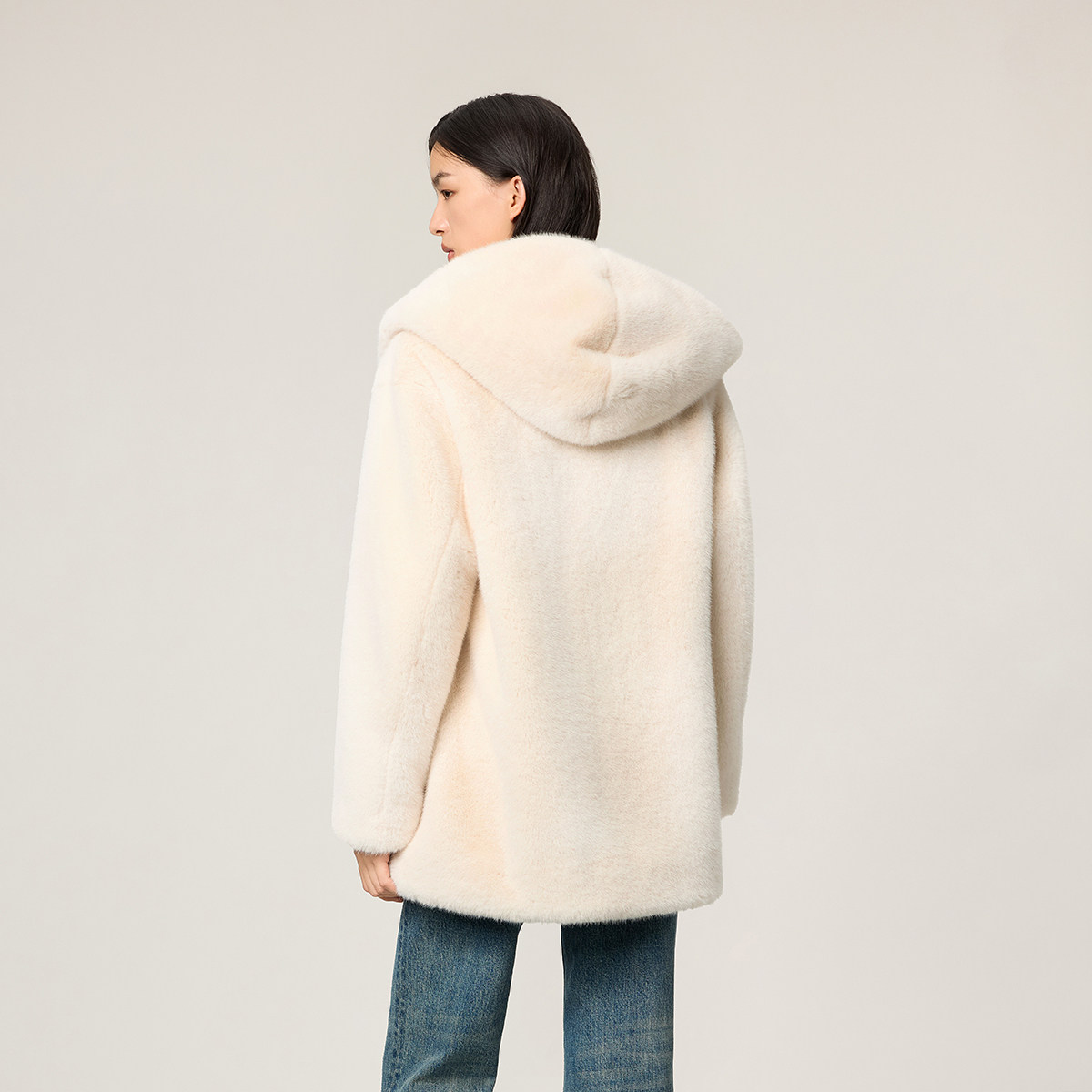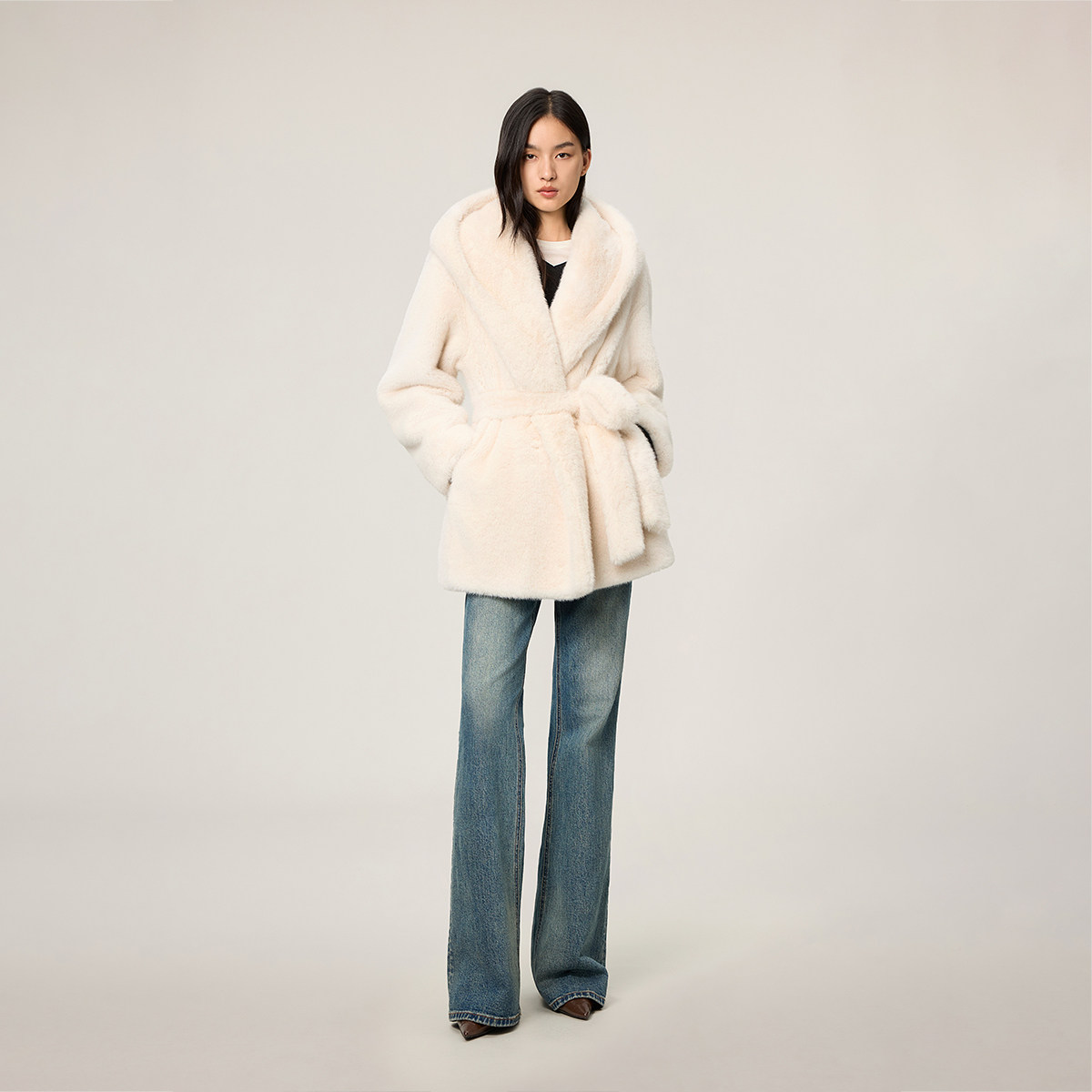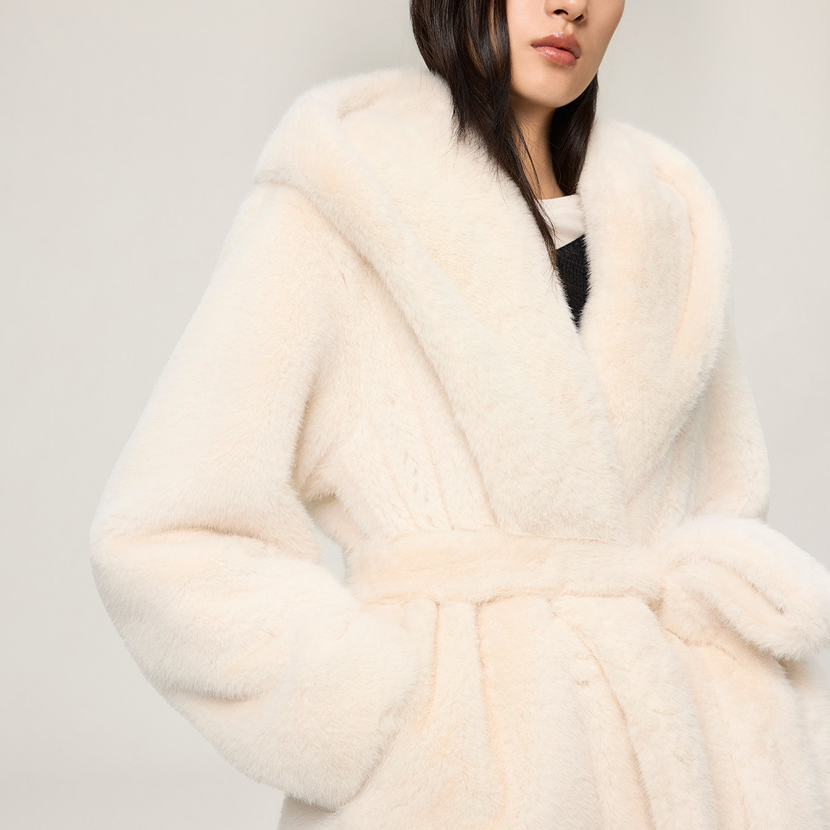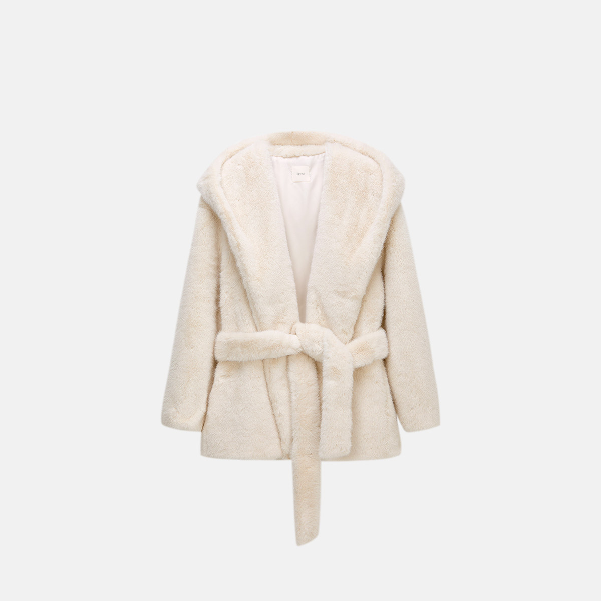 【新品】OCHIRLY欧时力 连帽袍式毛绒仿皮草外套中长款腰带2025冬
