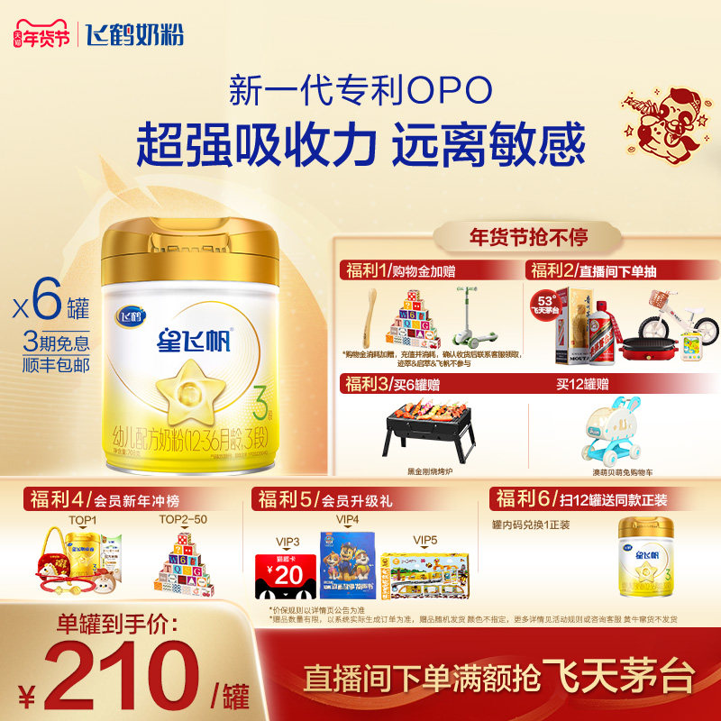 【官方正品】飞鹤星飞帆3段婴幼儿配方牛奶粉700g*6罐5HMO专利OPO