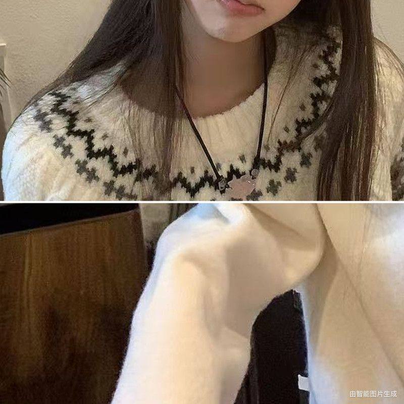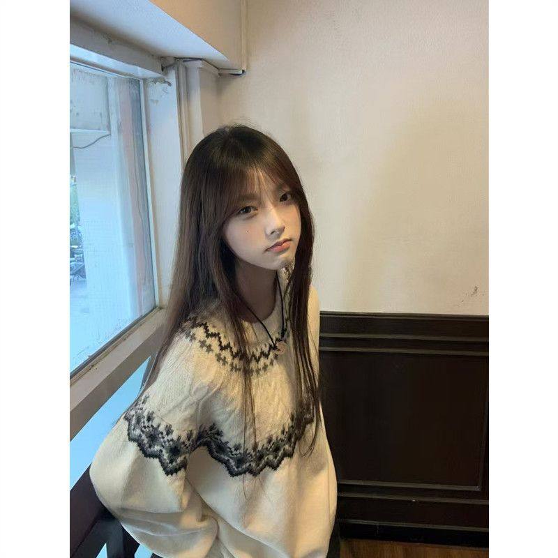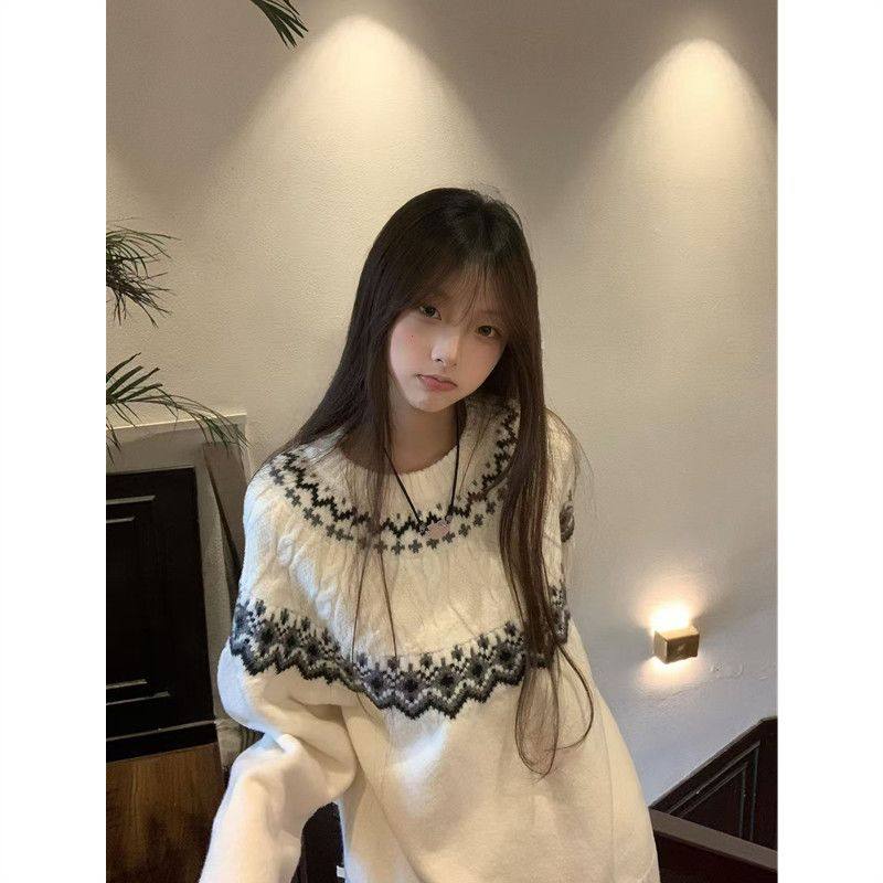 费尔岛白色圆领针织毛衣女慵懒风秋冬套头绞花保暖大码内搭上衣