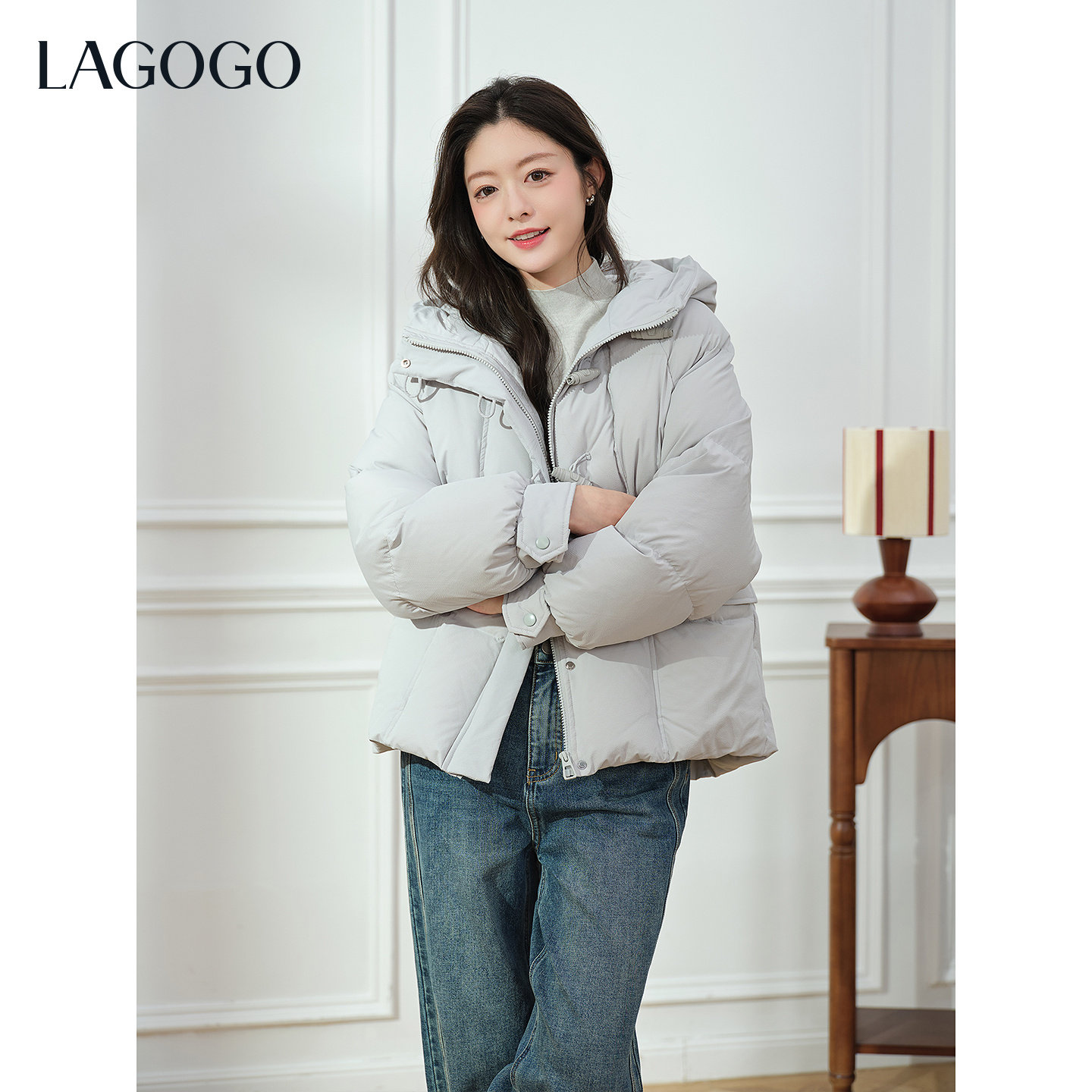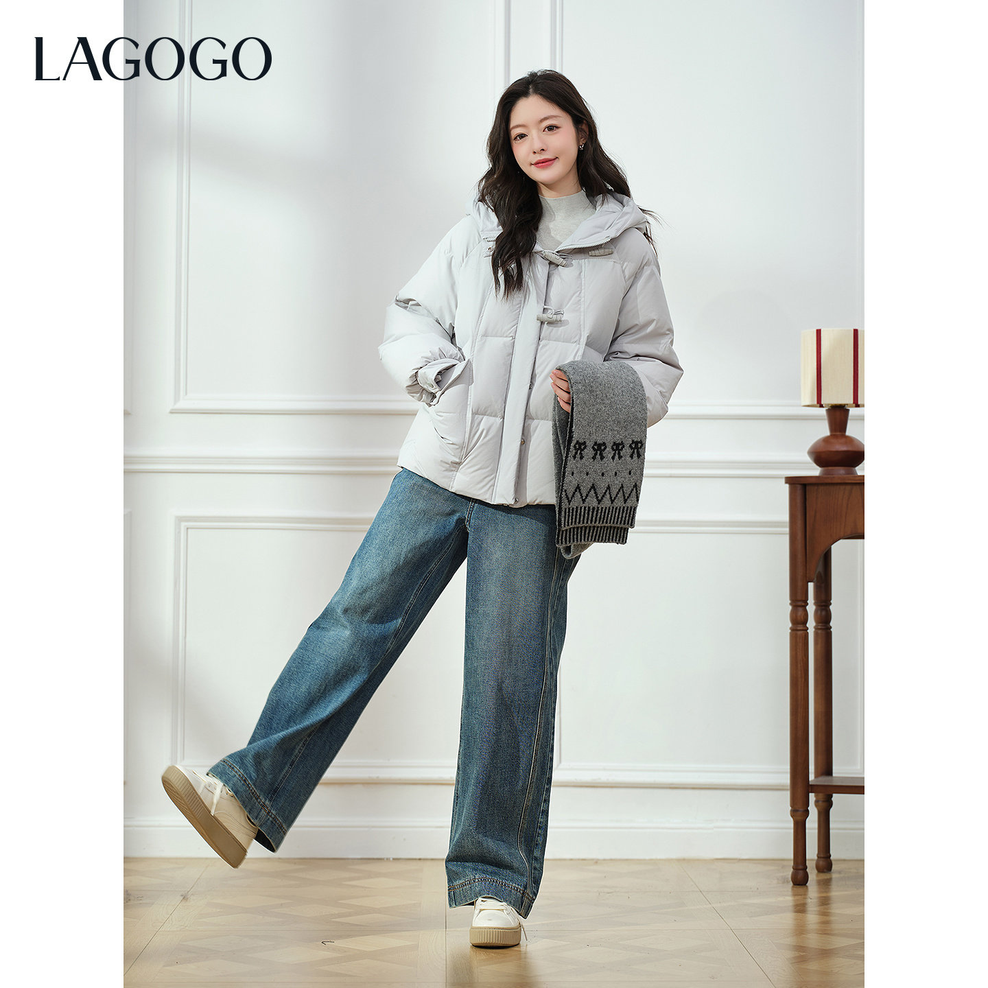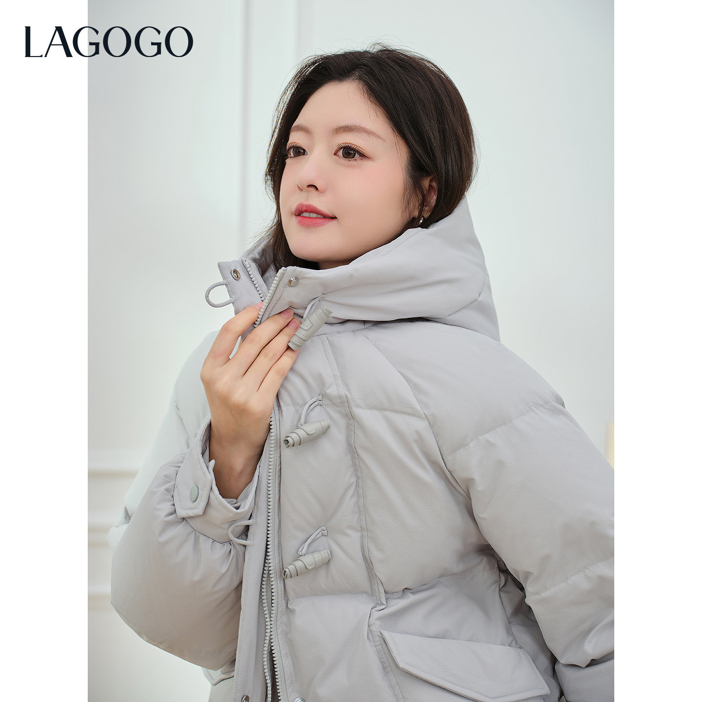 LAGOGO晴蓝拥暖仿牛角扣羽绒服女拉谷谷2025冬季新款连帽短款外套