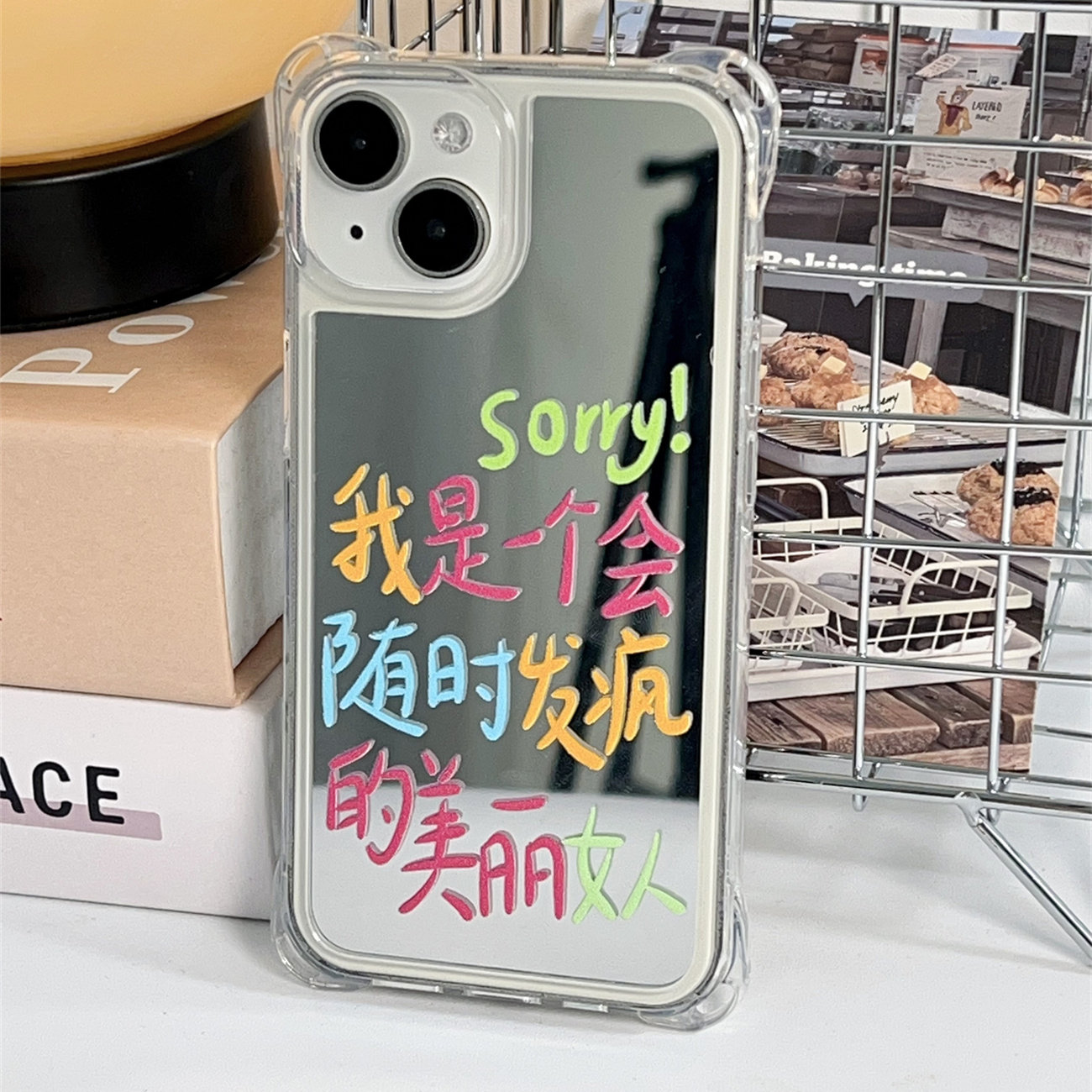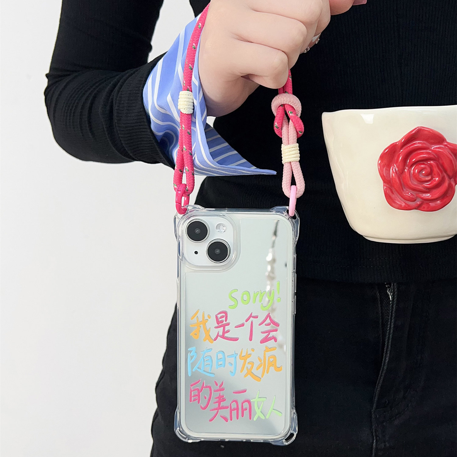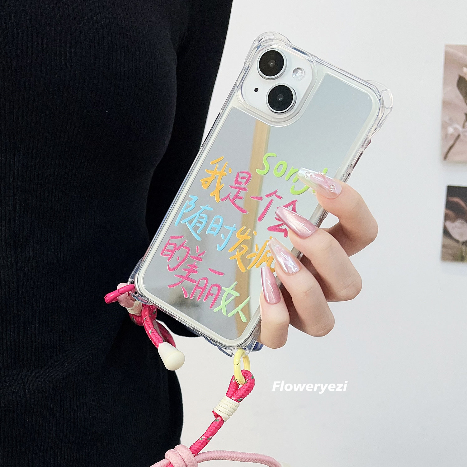 搞笑文字发疯美丽女人挂绳斜挎适用苹果16pro手机壳背带斜跨14补妆镜12四角开孔镜面iphone17手提硬壳保护套