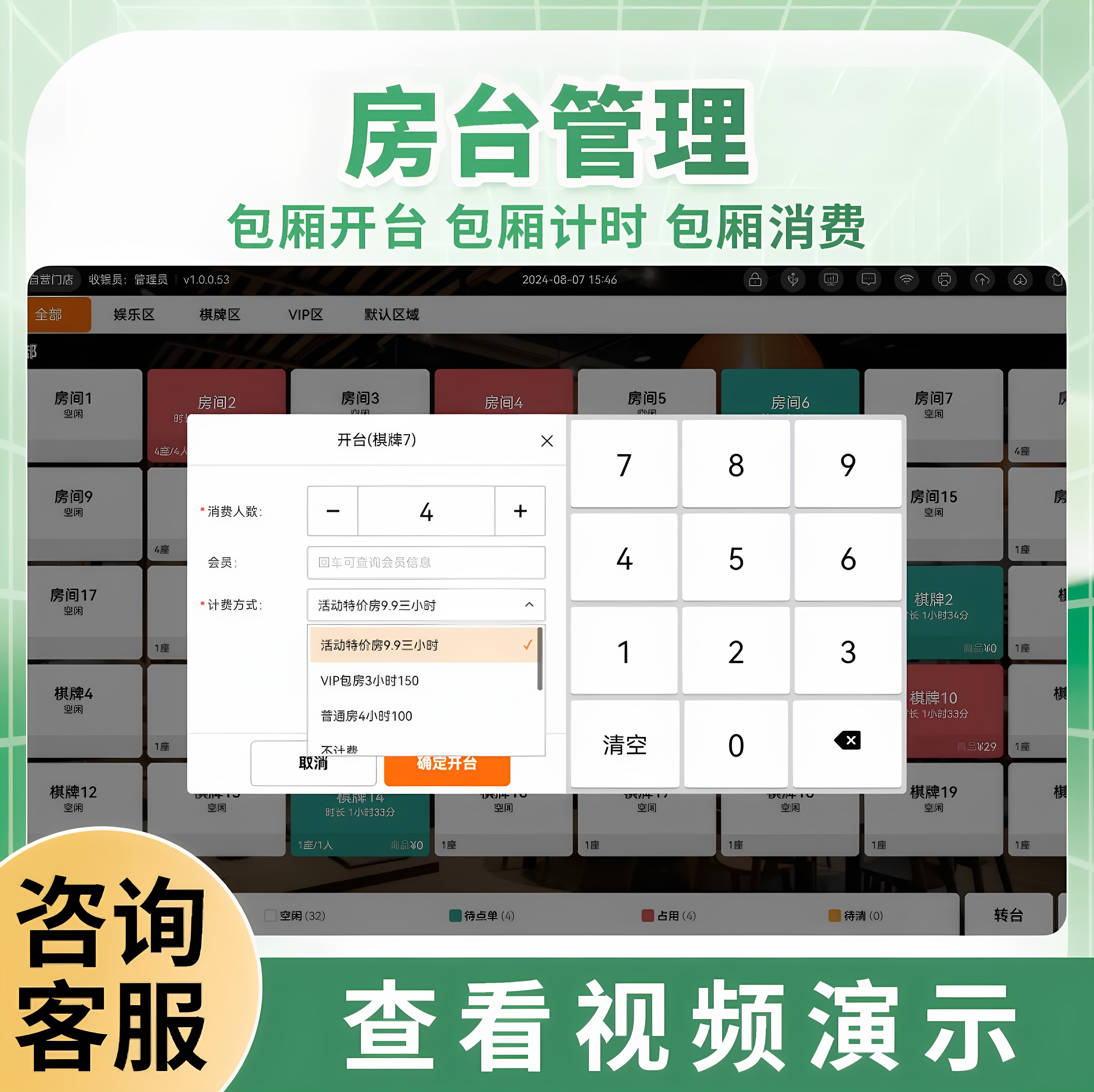 棋牌室麻将馆台球厅足浴收银系统一体机茶楼茶馆计时收费管理软件