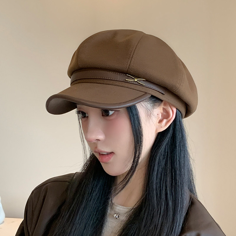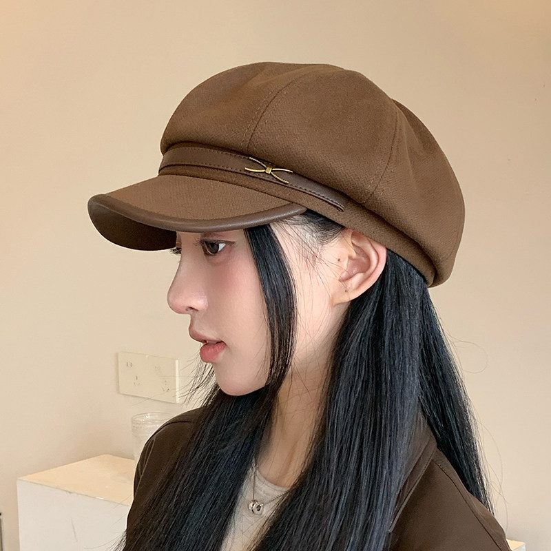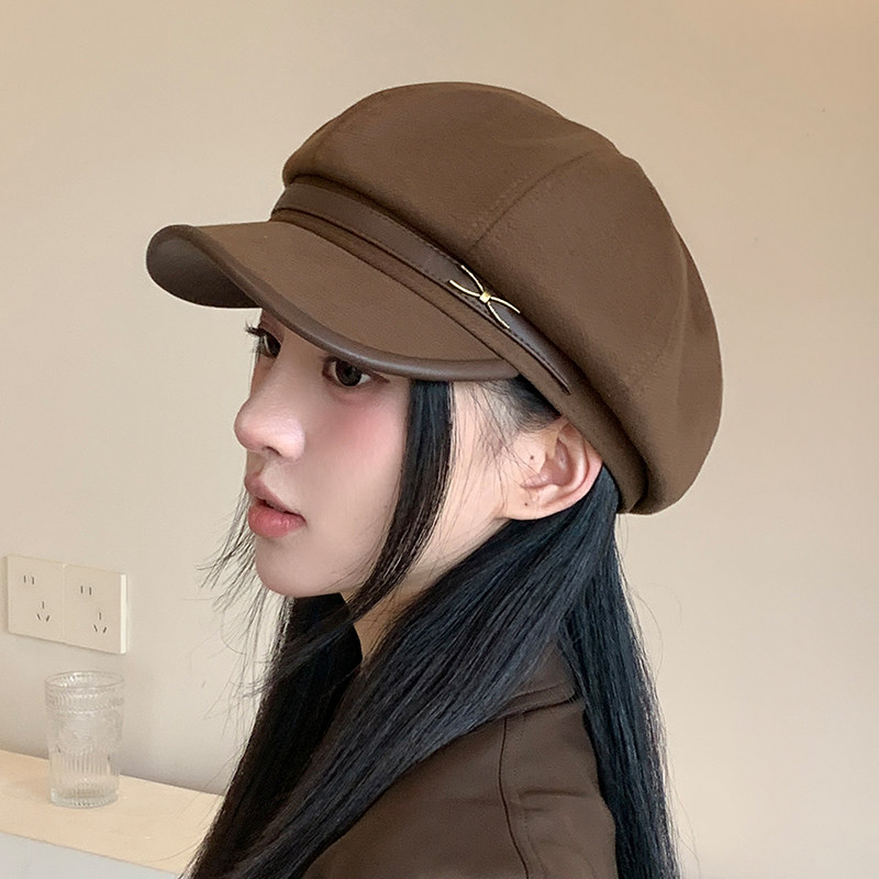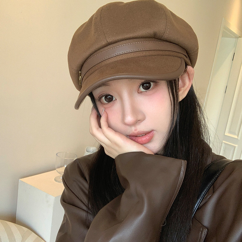 八角贝雷帽女春秋款时尚皮复古报童帽画家帽潮毛呢黑色咖色角帽
