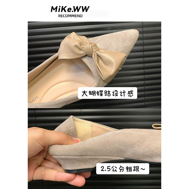 法式气质尖头绒面低跟浅口单鞋蝴蝶结2025秋季新款百搭通勤鞋粗跟