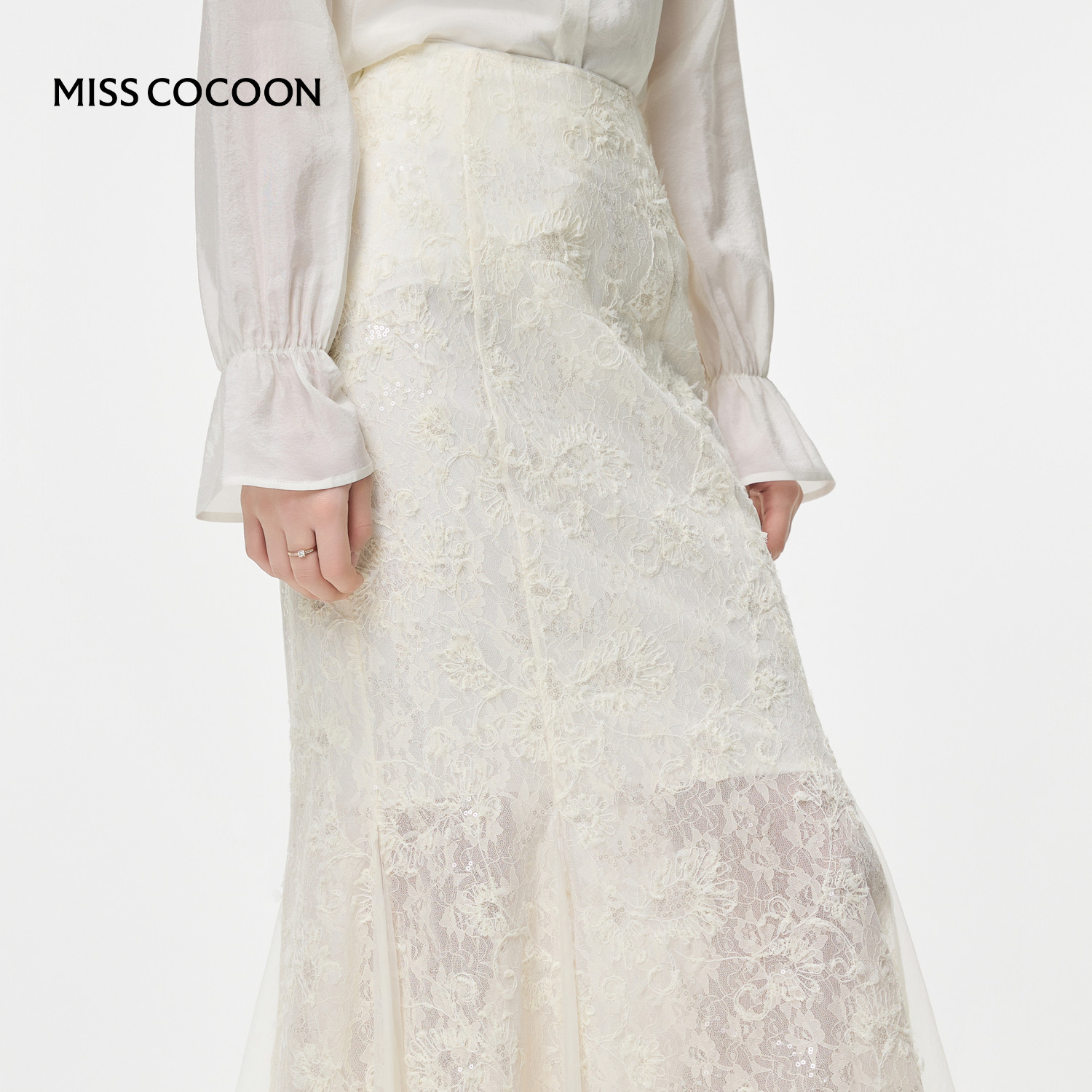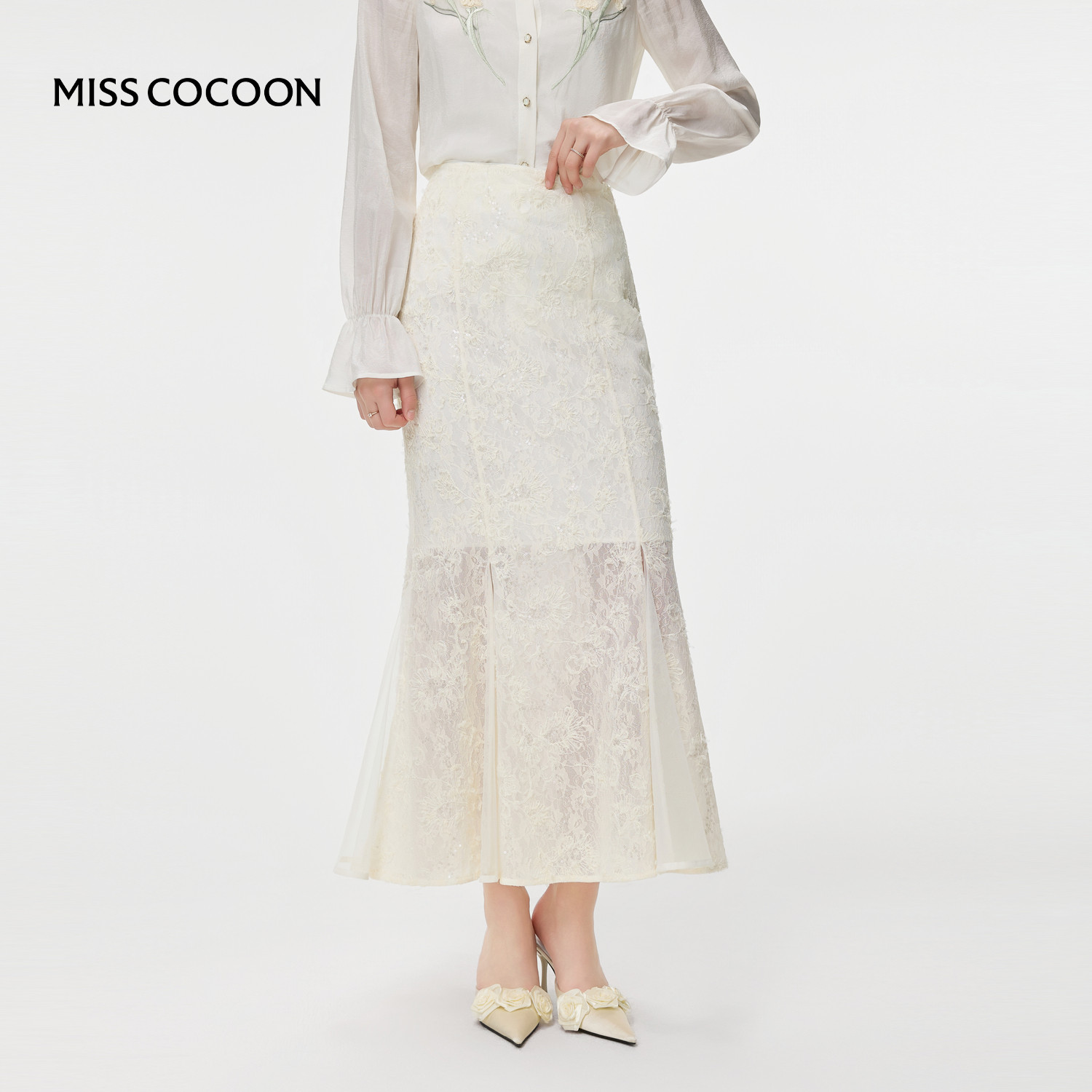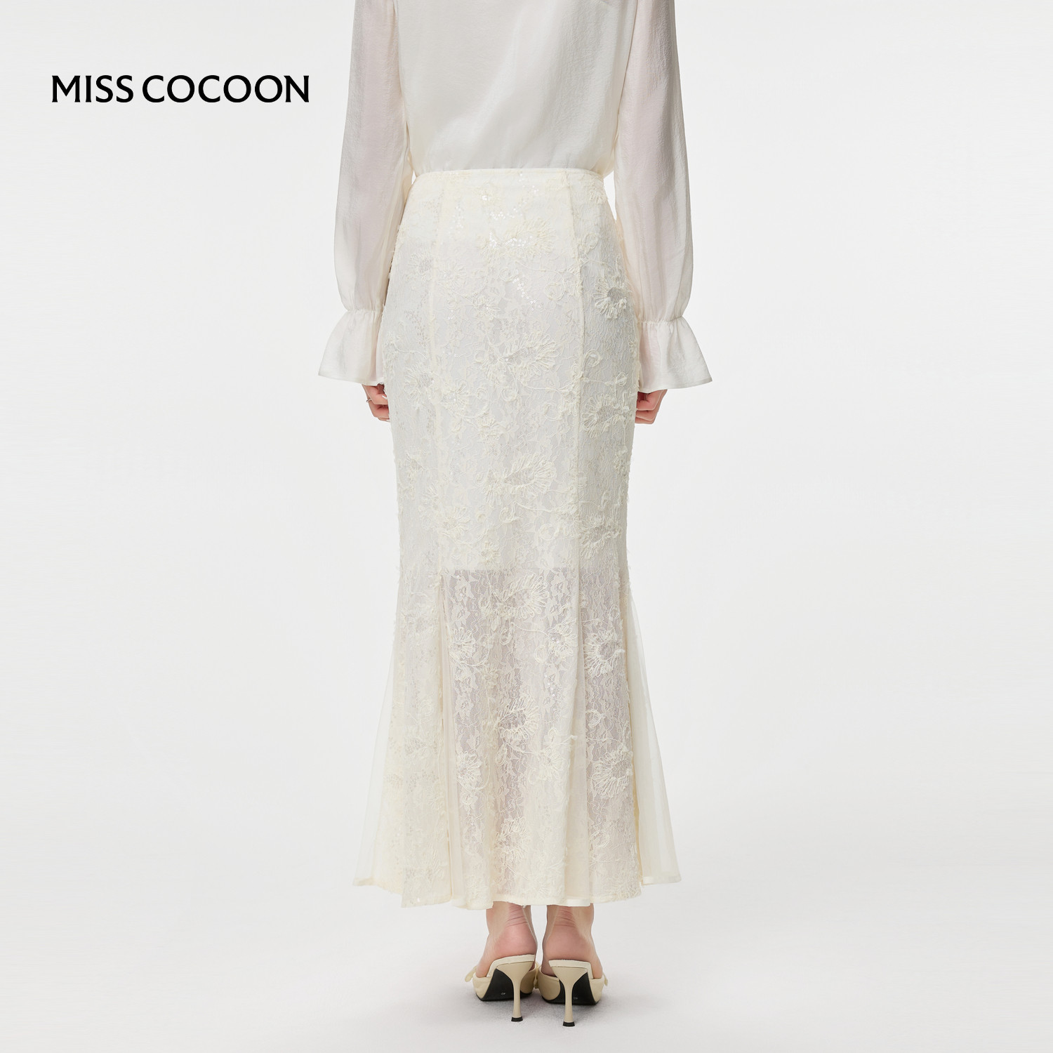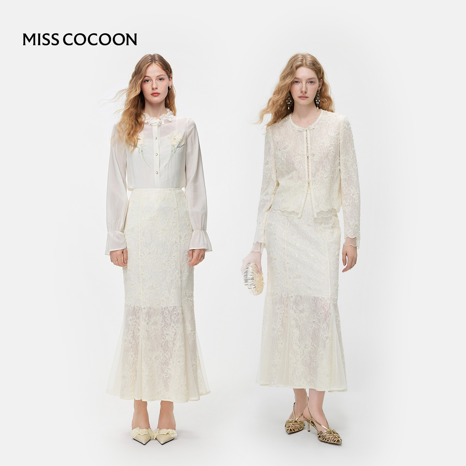 MISSCOCOON可可尼亮片蕾丝刺绣鱼尾裙女26春新款千金风白色半身裙