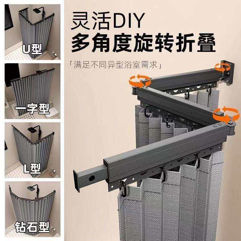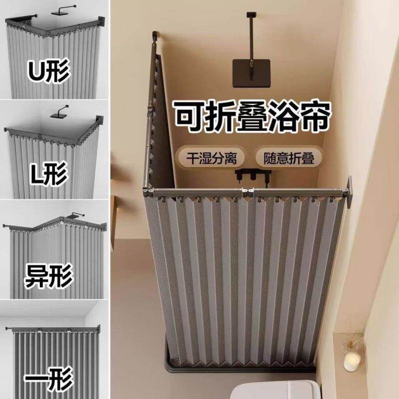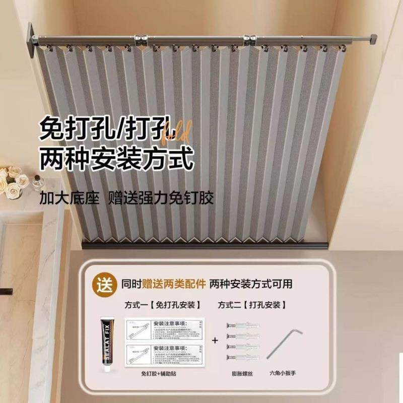 可折叠式杆浴帘套装隐形浴室隔断防水卫生间打孔高档干湿淋浴分离