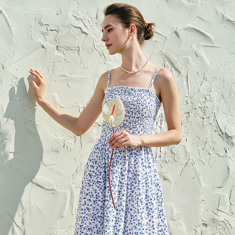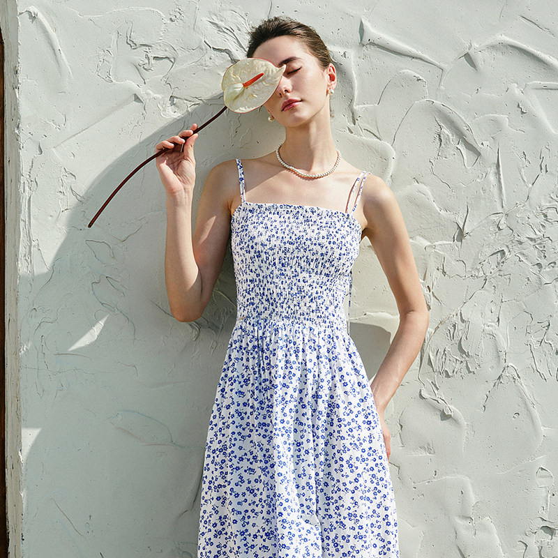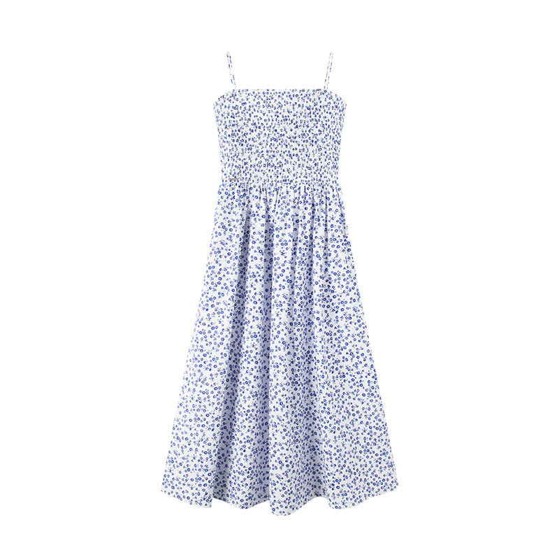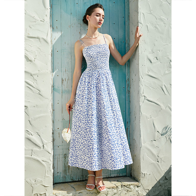 Navigare意大利小帆船蓝色碎花连衣裙夏季女A字抹胸吊带裙子