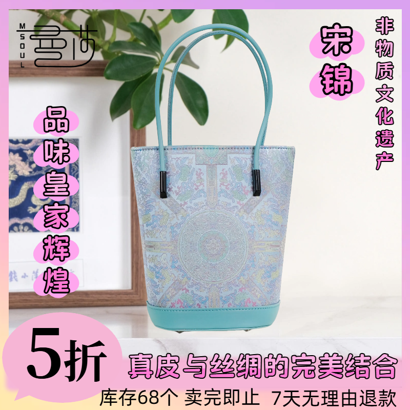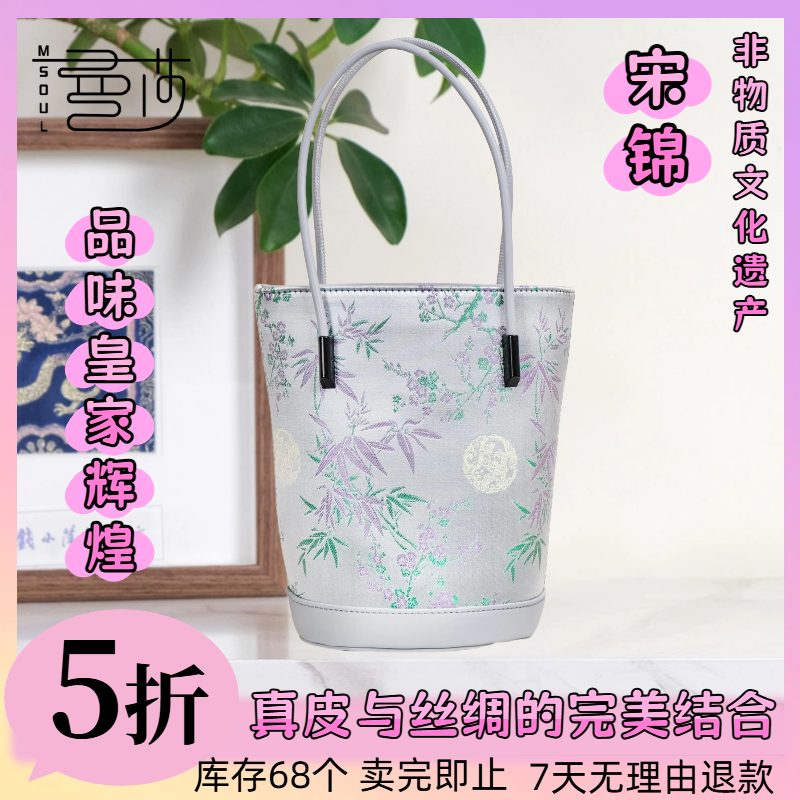 曼莎中国风宋锦香云纱手提单肩斜挎刺绣真丝牛皮新款女包2174