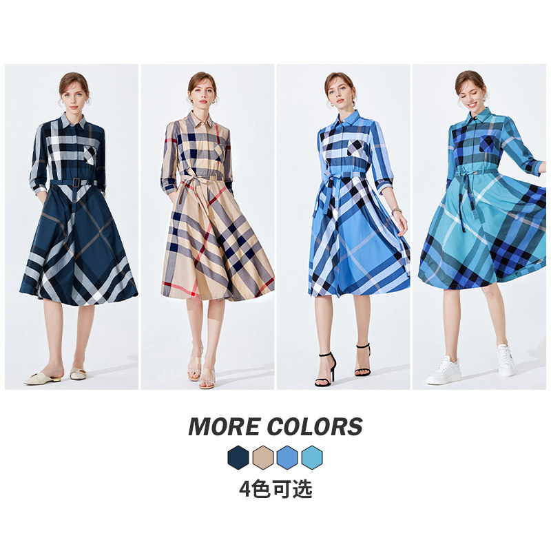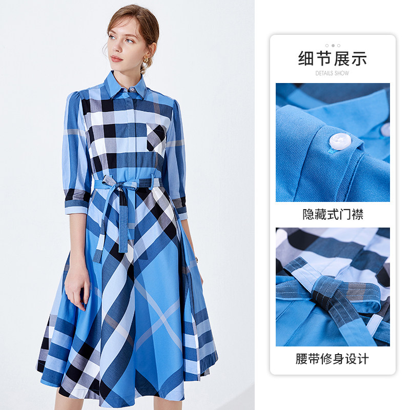Navigare意大利小帆船女士夏七分袖格子连衣裙腰带翻领衬衫a字裙