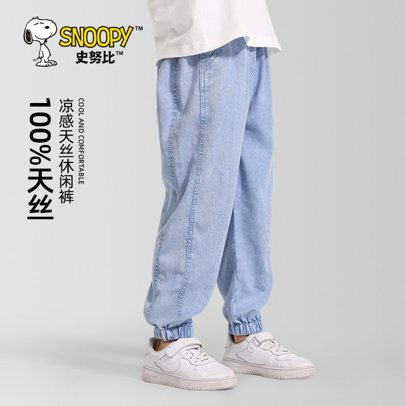 史努比男童天丝牛仔裤夏薄款2025新款男大童夏季长裤儿童防蚊裤子