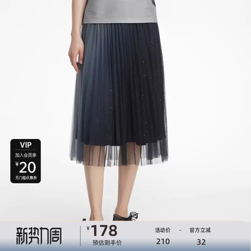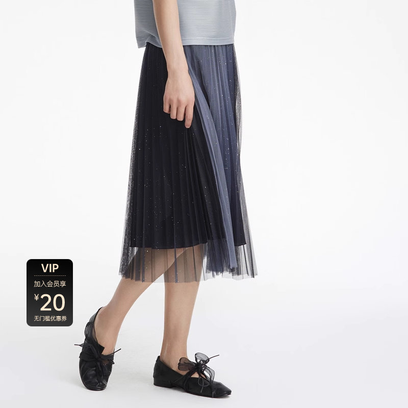 她池松紧腰百褶裙2025秋装新款女装时尚简约中长款A字高腰半身裙