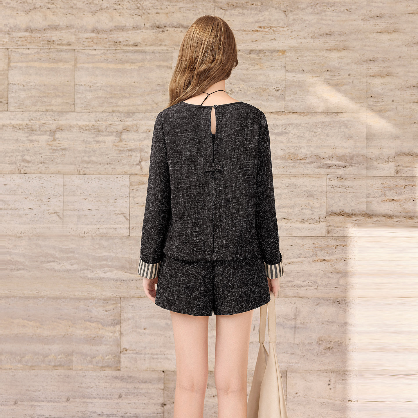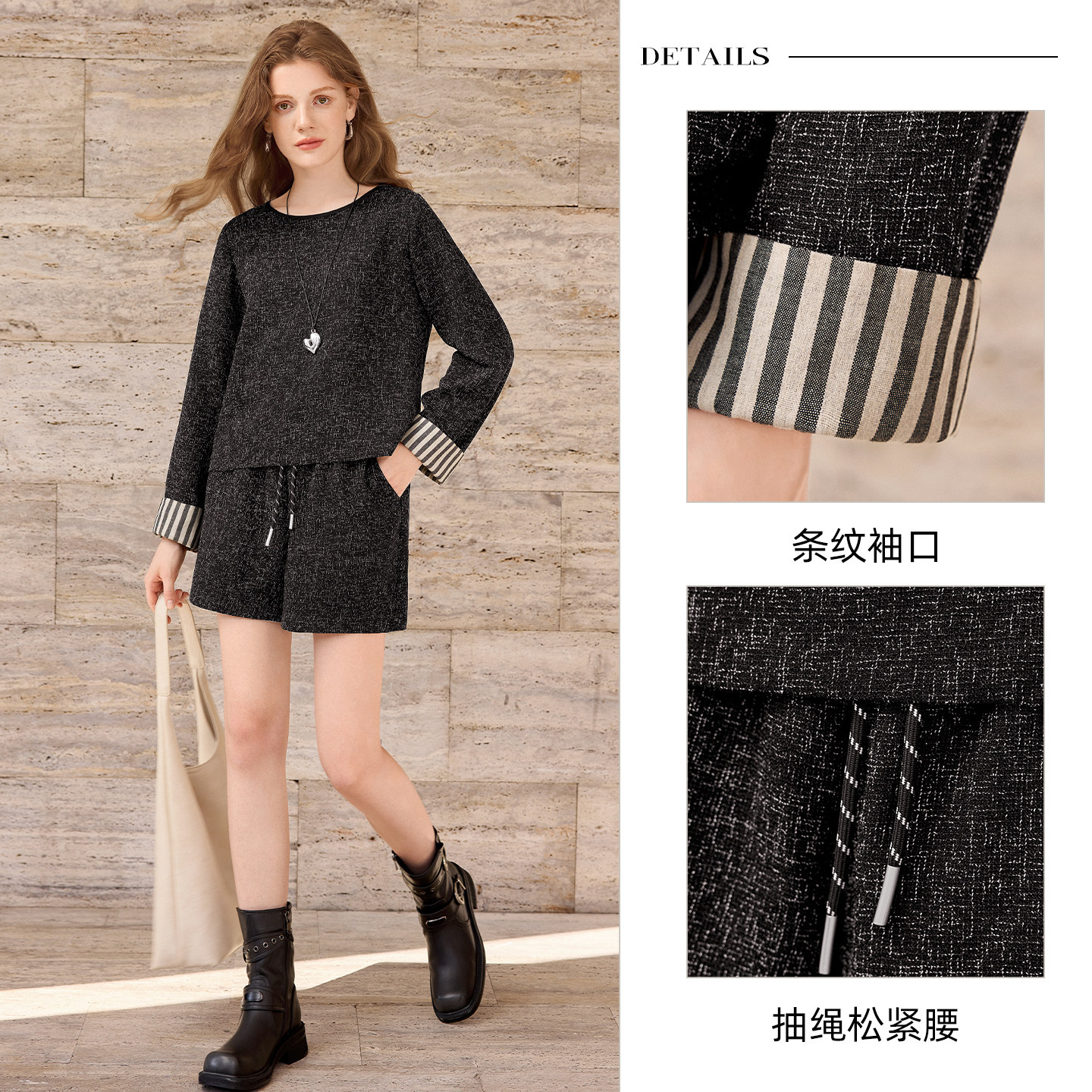 她池时尚套装2025秋装新款女装撞色上衣搭阔腿短裤休闲风两件套