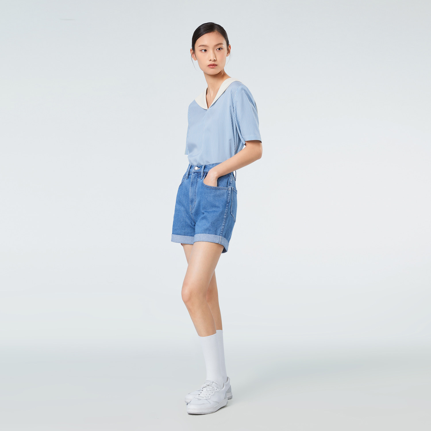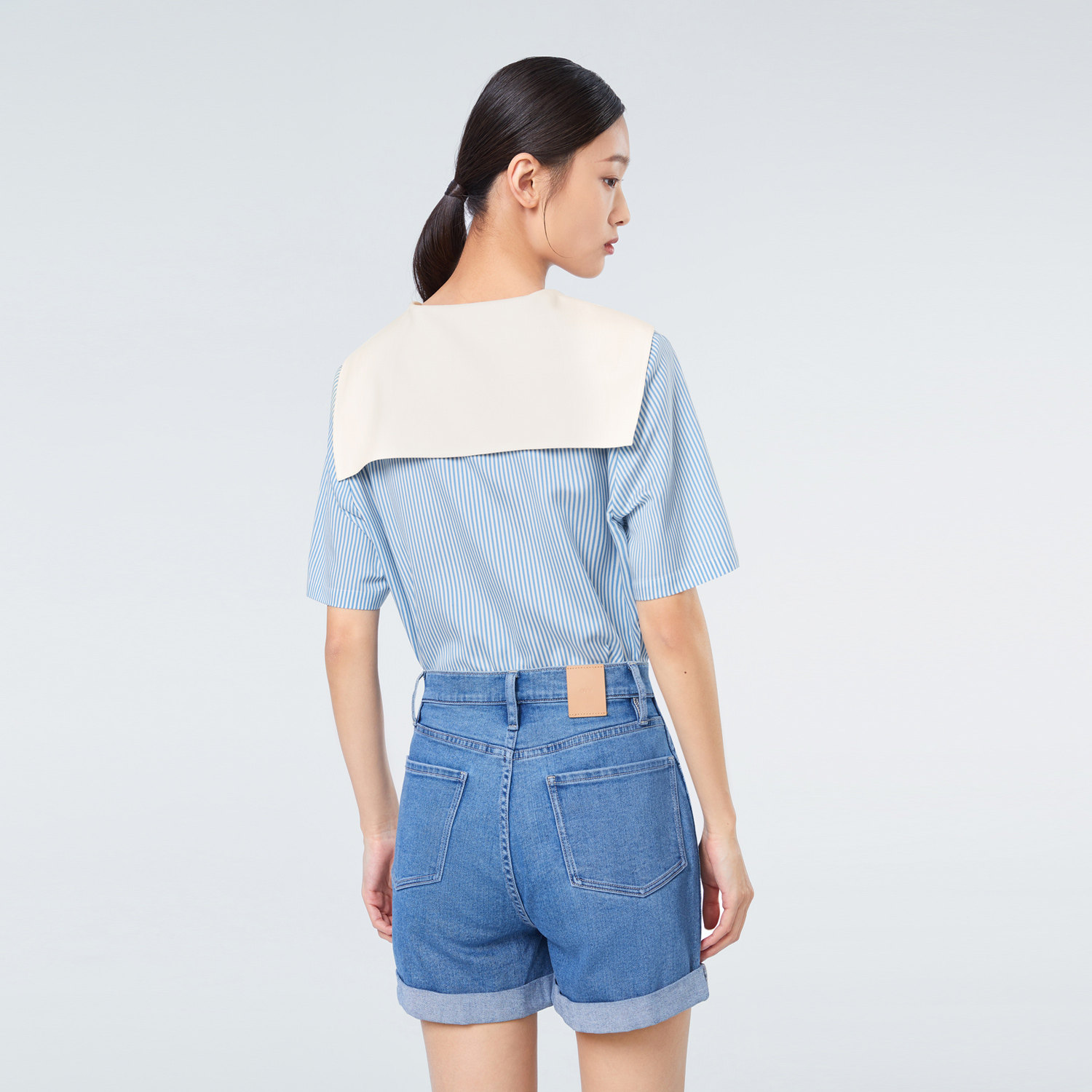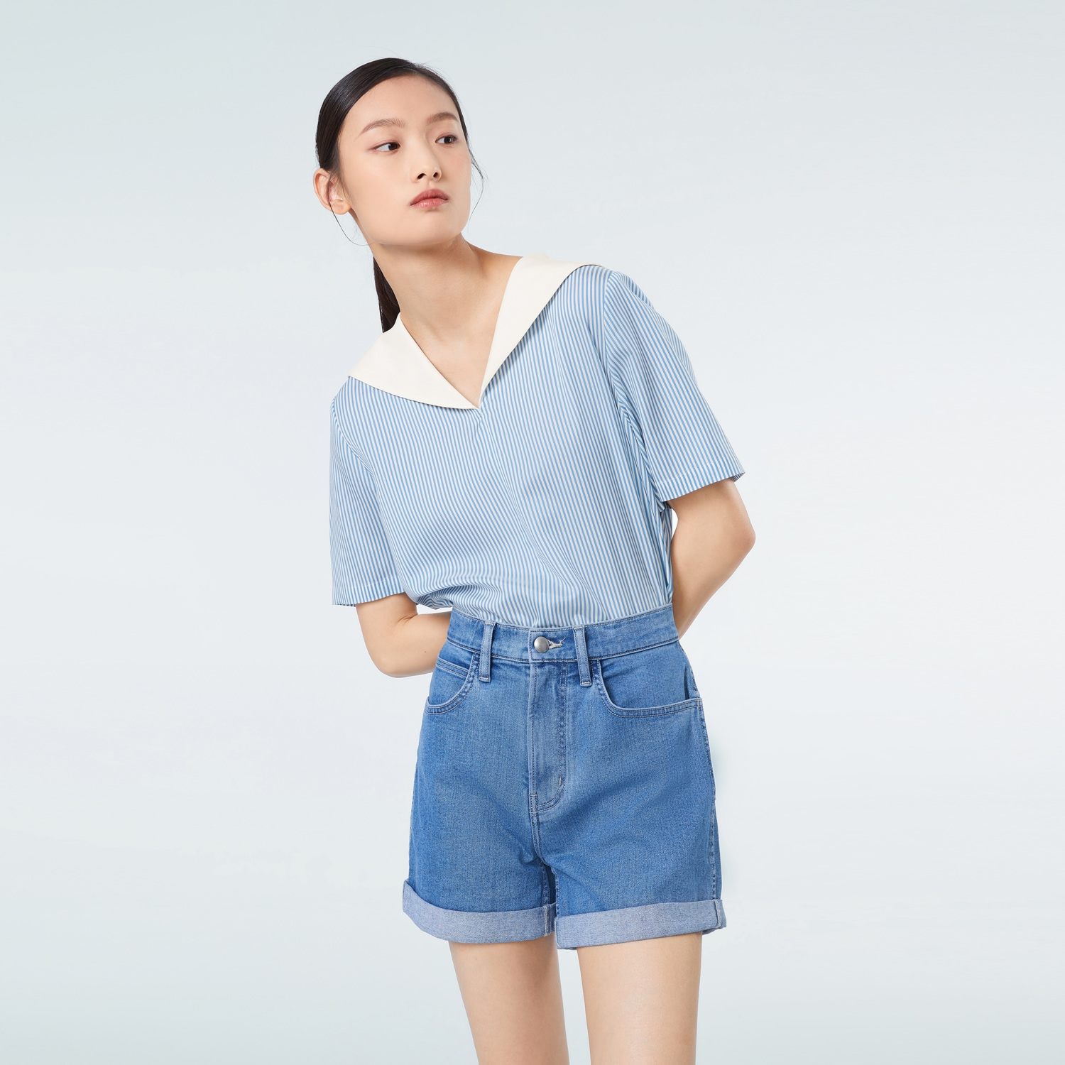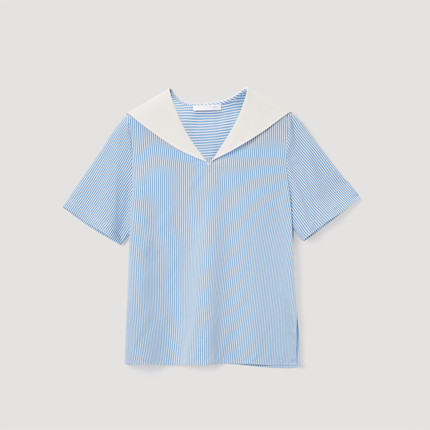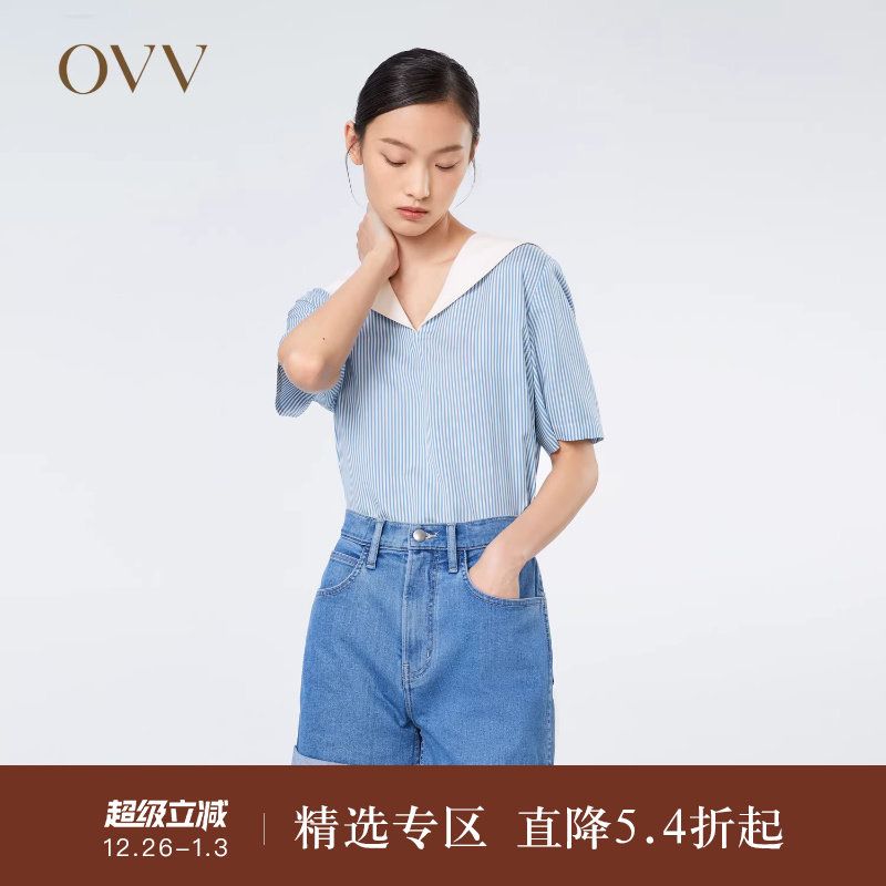 OVVOutlet【重磅真丝】春夏新款女元气海军领条纹短袖衬衫上衣