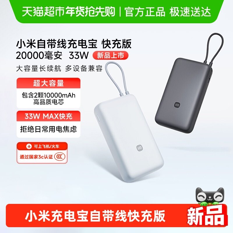 【3C认证】小米充电宝自带线快充版20000 33W可充手机平板耳机