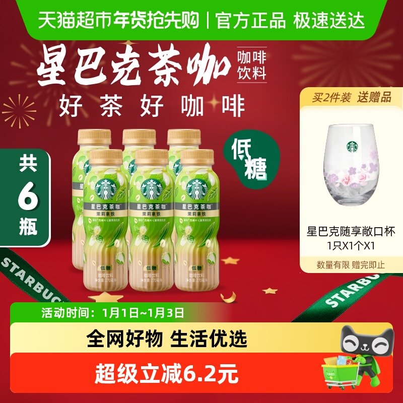 Starbucks/星巴克茶咖茉莉拿铁270ml*6瓶低糖即饮咖啡瓶装饮料