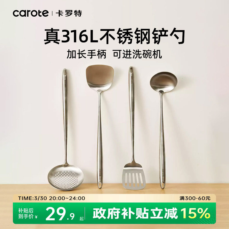 卡罗特316L不锈钢锅铲加长手柄炒菜铲子漏勺汤勺炒勺家用厨房工具