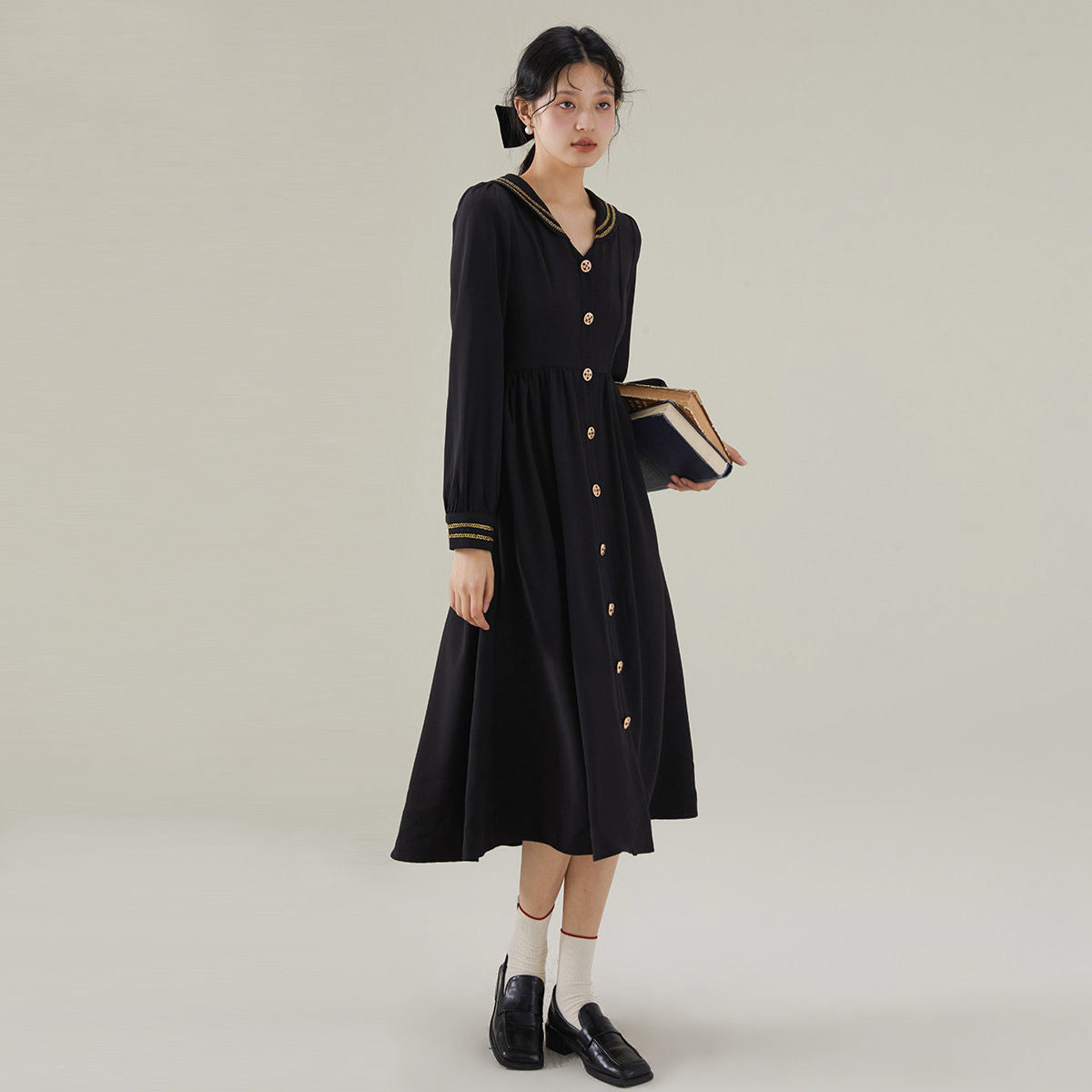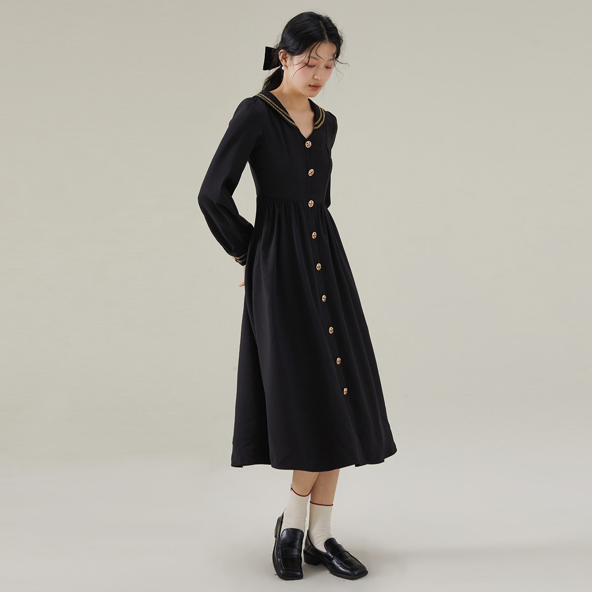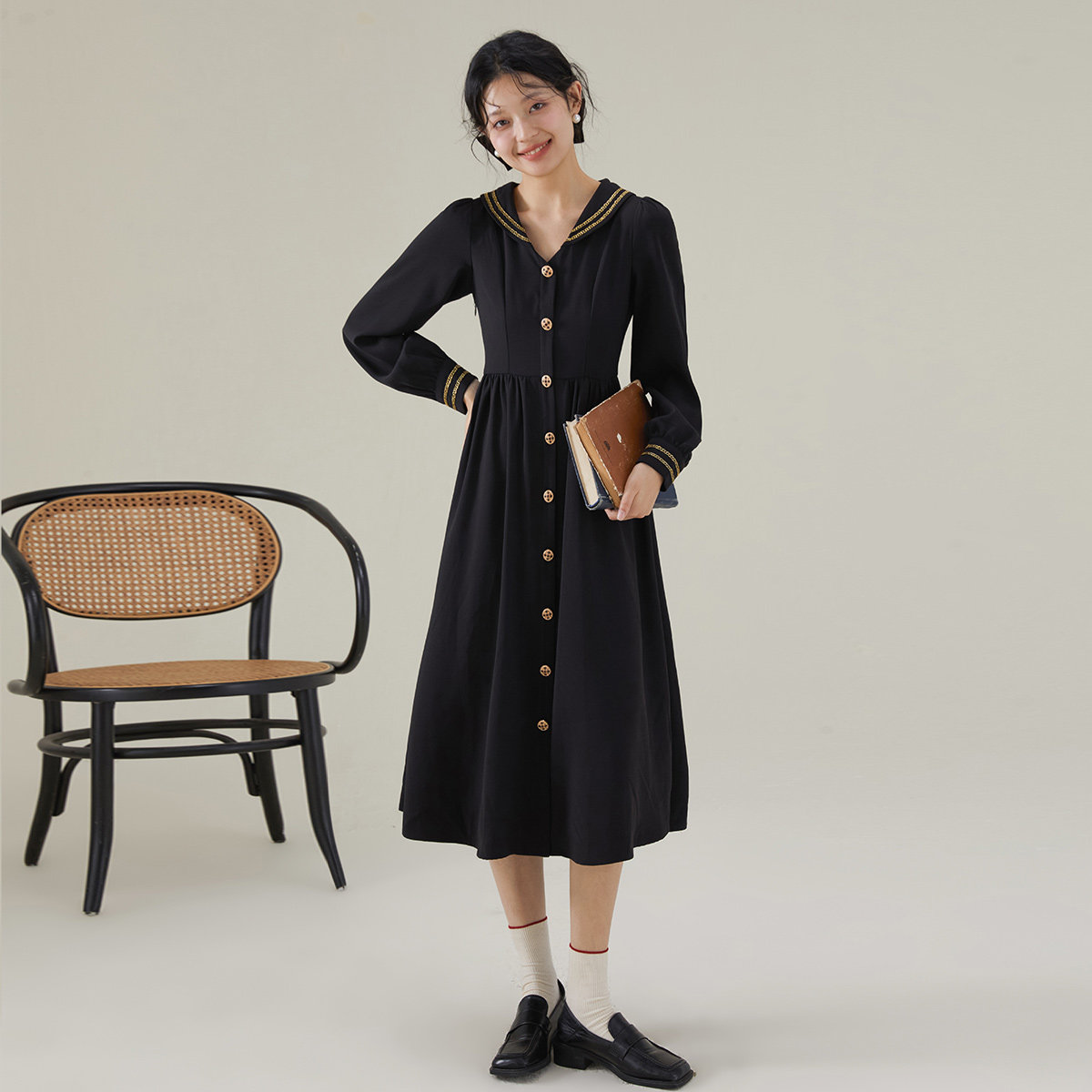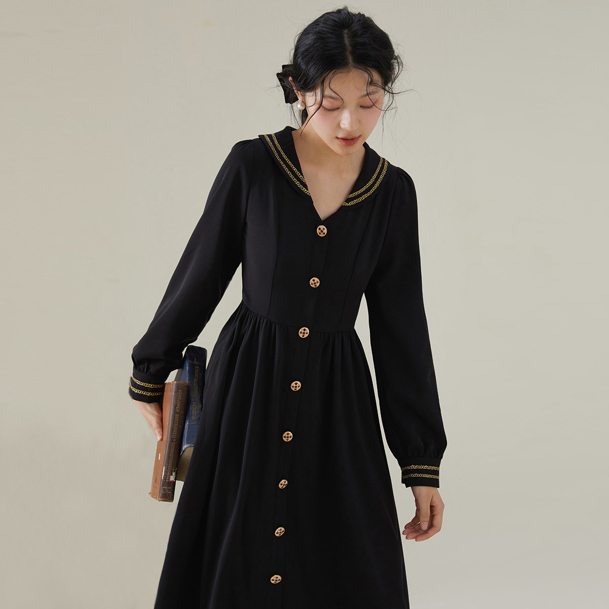 one more2026春长袖翻领小香风法式连衣裙高级感女收腰显瘦雪纺裙