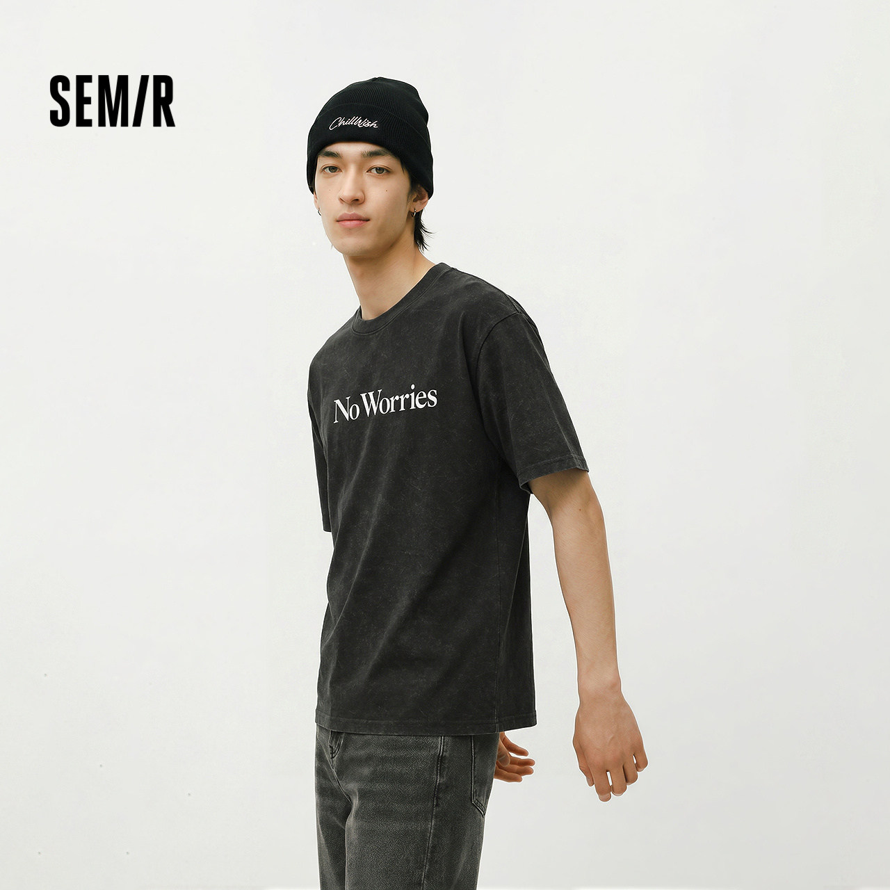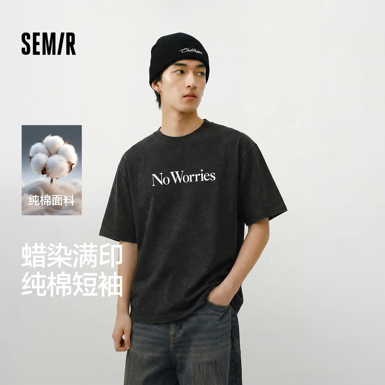 森马短袖T恤男夏季蜡染宽松圆领满印针织衫简约字母纯棉上衣潮流