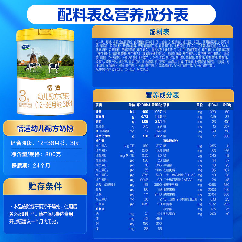 君乐宝恬适3段幼儿配方奶粉12-36个月HMOs小分子蛋白