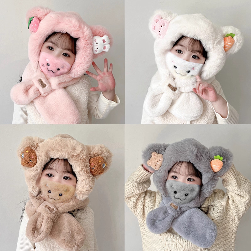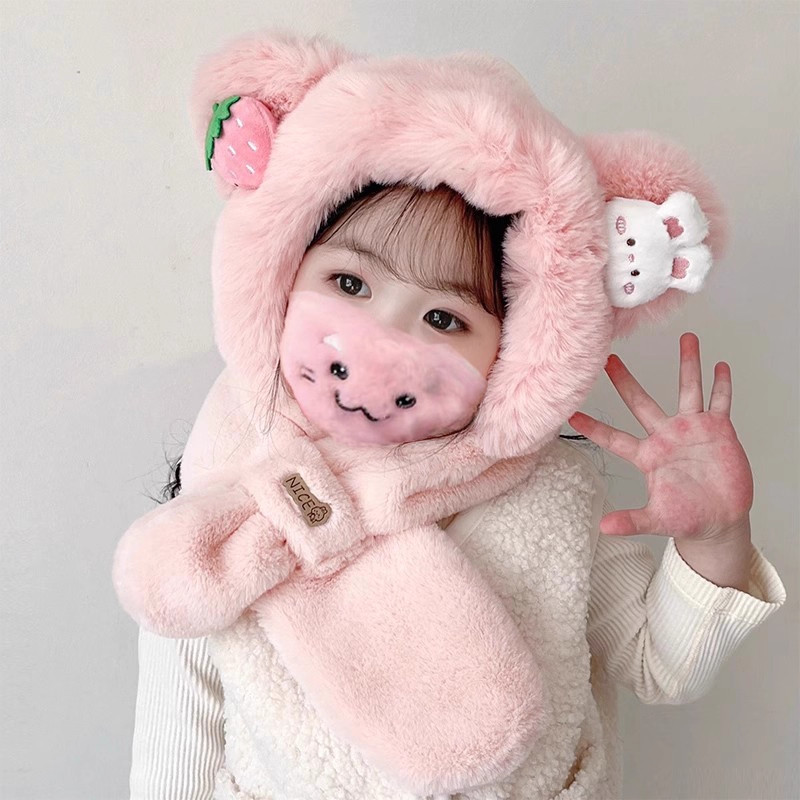 尼多熊儿童帽子围巾一体冬季防风帽宝宝毛绒护耳帽女童加厚保暖帽